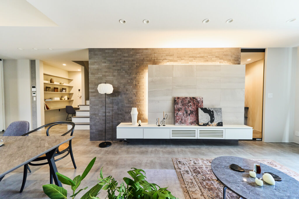 リビングボードの壁面に2種類の「エコカラット」を張り分け、質感の違いが上質な高級感を演出します。