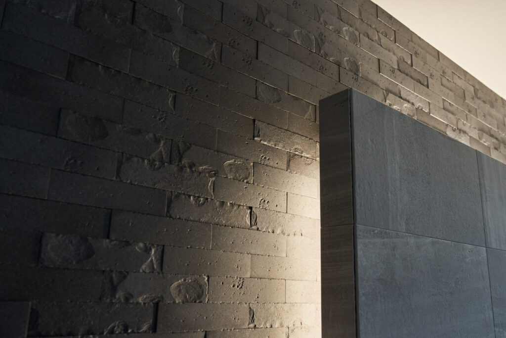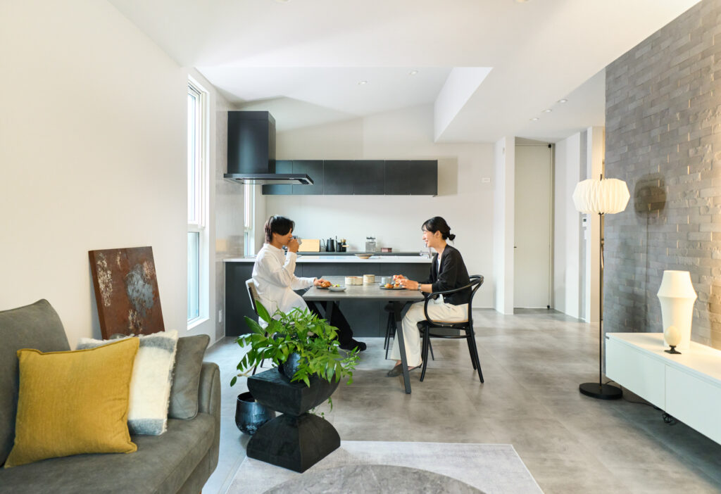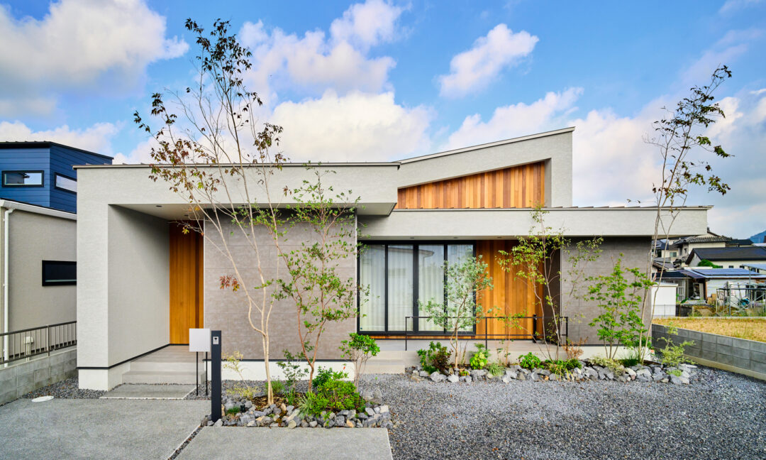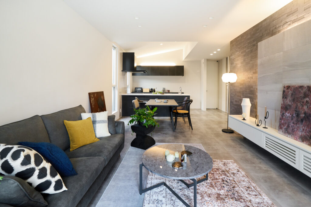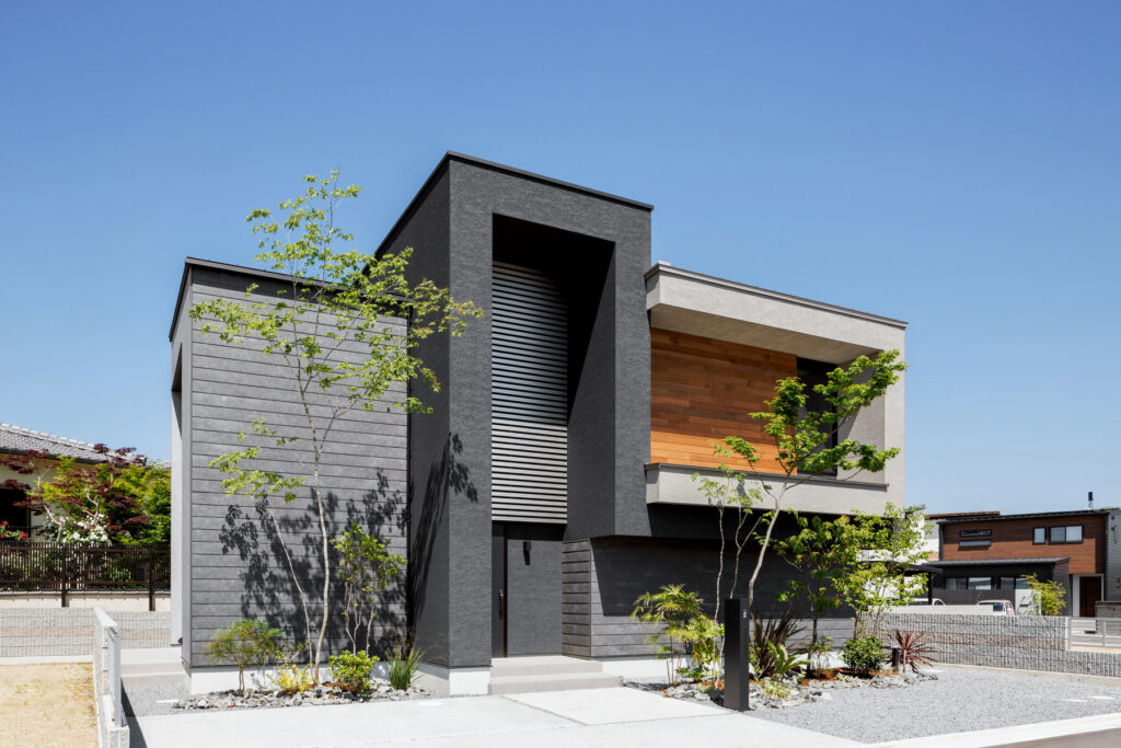 吹付塗装と木目を組み合わせた外観は、凹凸のある立体的な構えで通りに静かな存在感を放ちます。室内はグレーを基調としながら、所々にダークカラーをアクセントに。空間を引き締め、ホテルのような洗練された雰囲気を生み出しています。