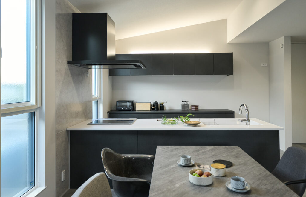フルフラットキッチンと勾配天井を照らす間接照明により、シックな空間にも伸びやかな広がりが生まれます。
