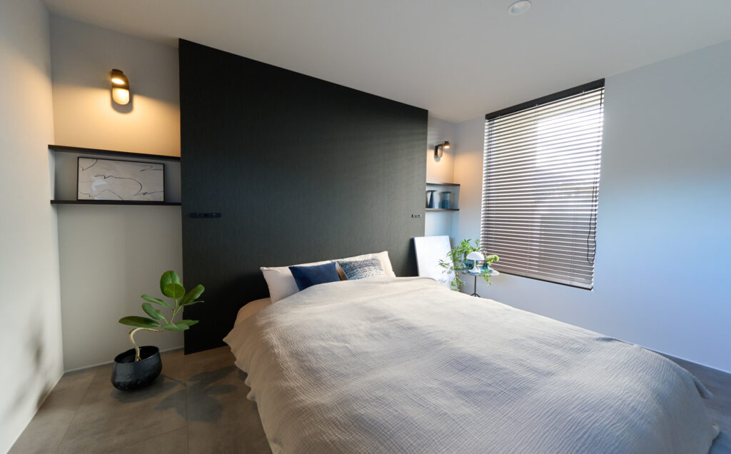 造作棚と中央の壁にダークカラーを配し、シンメトリーな美しさを追求。海外ホテルのような気品あふれる寝室です。