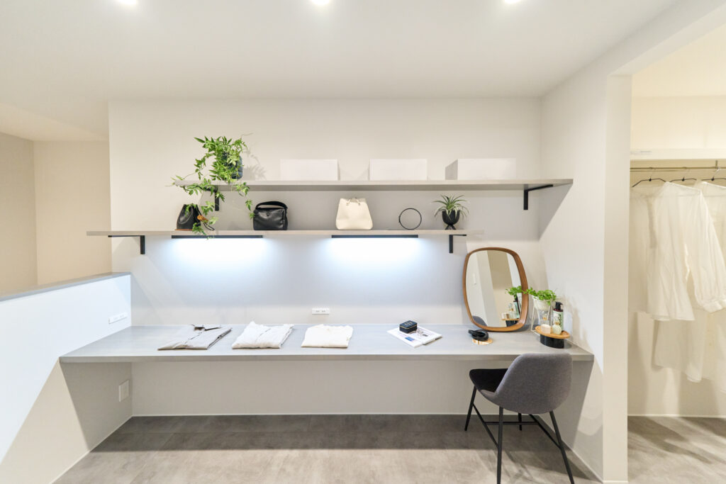 寝室の一角に設けたパウダーコーナーは、朝の準備や就寝前のひとときを穏やかに彩ります。2階の廊下スペースにはスタディコーナーを配置し、子ども部屋と向かい合わせにすることで勉強と遊びのメリハリが生まれます。日々の暮らしのなかに、ゆとりと静けさが自然と紡がれます。