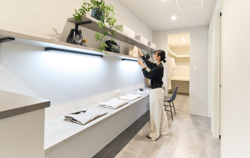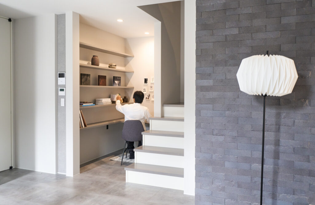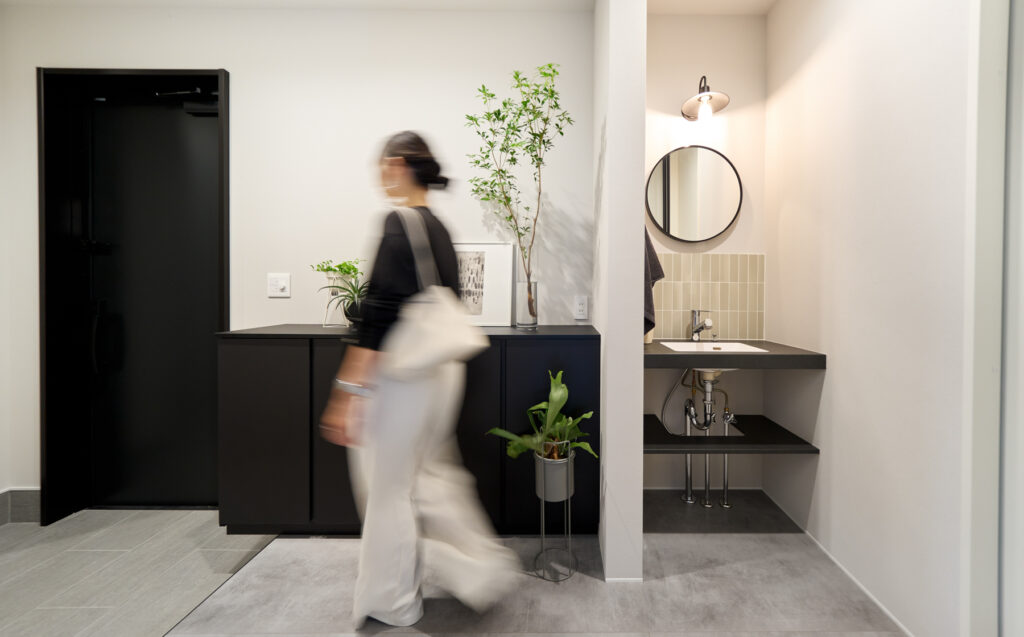 リビングを中心に各所へとアクセスできる間取りは、家族が自然と顔を合わせる機会を生み出します。LDK横の書斎スペースは家族の気配を感じながらも集中できる場所に。玄関には身だしなみを整えられるスペースがあり、帰宅してすぐに手を洗える動線が日々の暮らしを支えています。