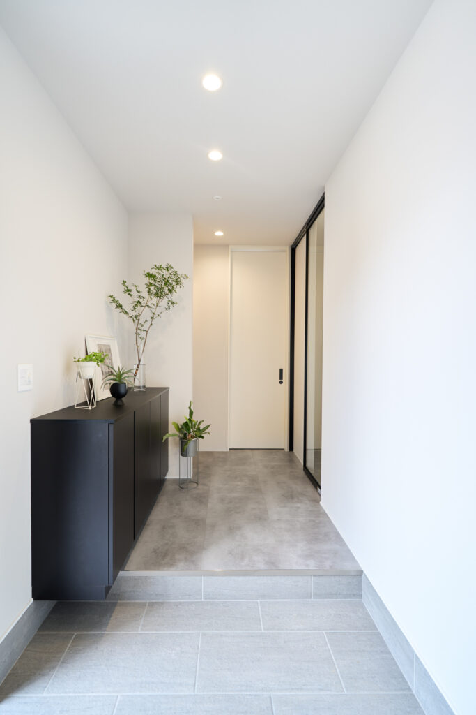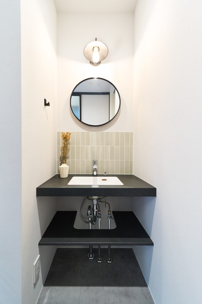 4.5帖の玄関に造作洗面化粧台を設置。帰宅時の手洗いや外出前の身だしなみチェックが可能です。
