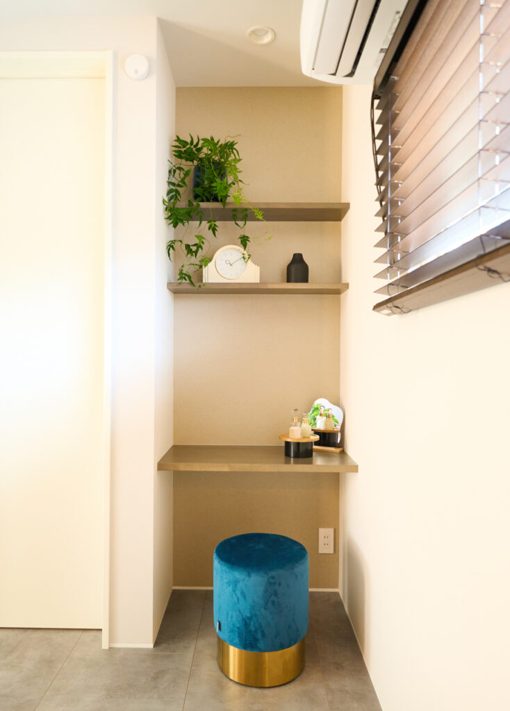 寝室の一角にあるパウダーコーナー。穏やかな朝のひとときを生み、「朝の時間が心地よくなりました」とIさん。