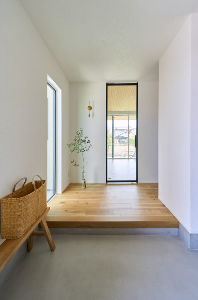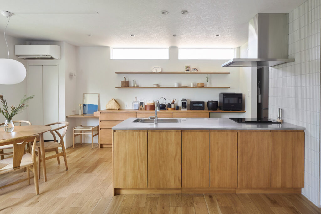 装飾をそぎ落とし、素材そのものの表情を大切にした平屋です。白と木を基調にしたジャパンディな世界観が室内に静かに広がり、どこにいても落ち着いた空気が漂います。シンプルな構成の中に質感の違いが重なり、見るたびに新しい表情を見せる空間が、住む人の感性をやさしく満たしてくれます。