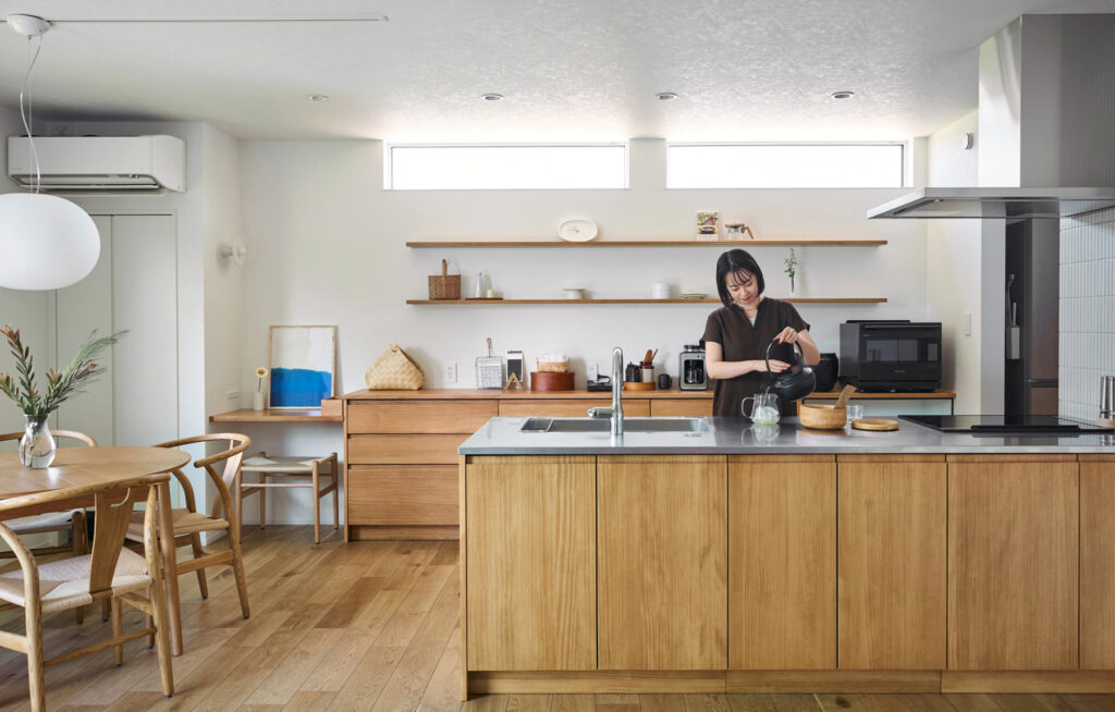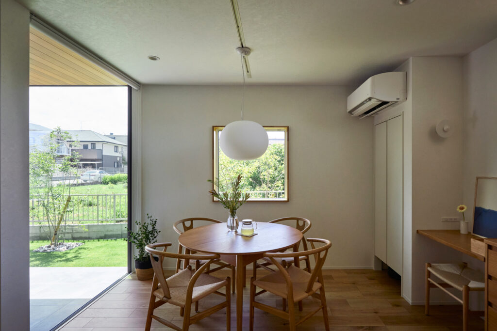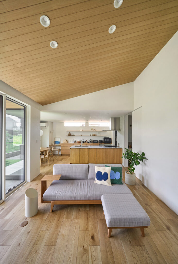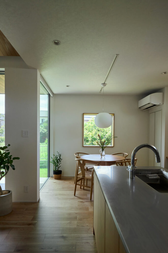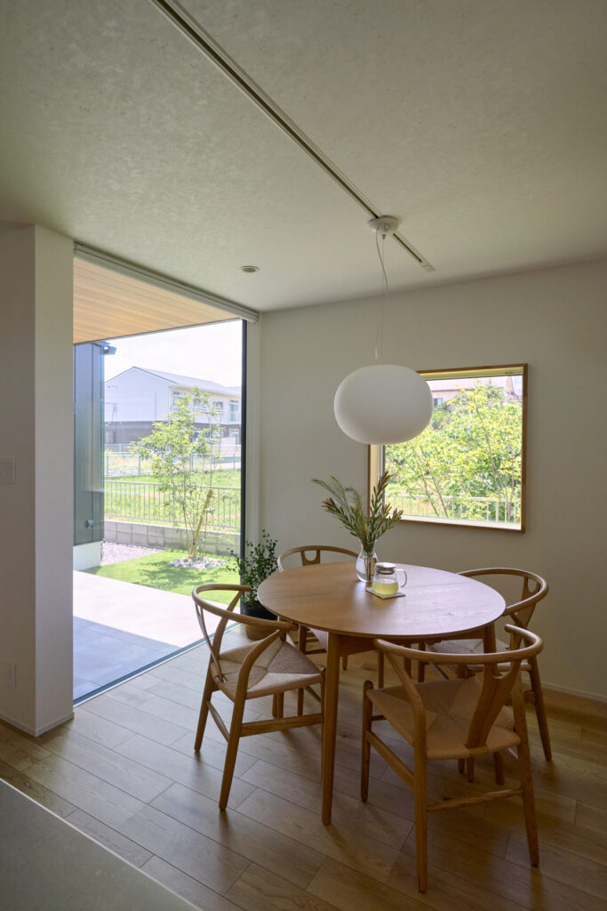 天井が高く伸びるリビングは、大きな開口部を通じて庭へとそのままつながります。屋内にいながら緑の気配を身近に感じられる設計で、LDKに集まる家族の会話が自然と弾む場所です。キッチンからダイニング、リビングへと緩やかに流れる空間構成が、家族それぞれの時間を穏やかに包み込みます。
