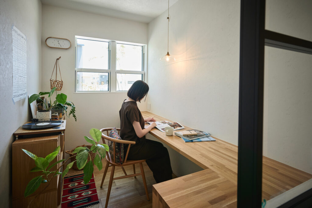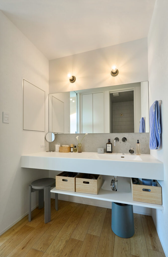 深く張り出した軒が、夏の強い日差しをやわらげ、冬に柔らかな陽光を室内へと招き入れます。季節ごとに光の角度が変わるたびに、邸内の表情も少しずつ移ろいます。書斎では手元を照らすペンダントの光の下で静かな時間が流れ、白を基調とした洗面では清潔な朝が始まります。暮らしの細部に、丁寧な設計の息づかいを感じます。
