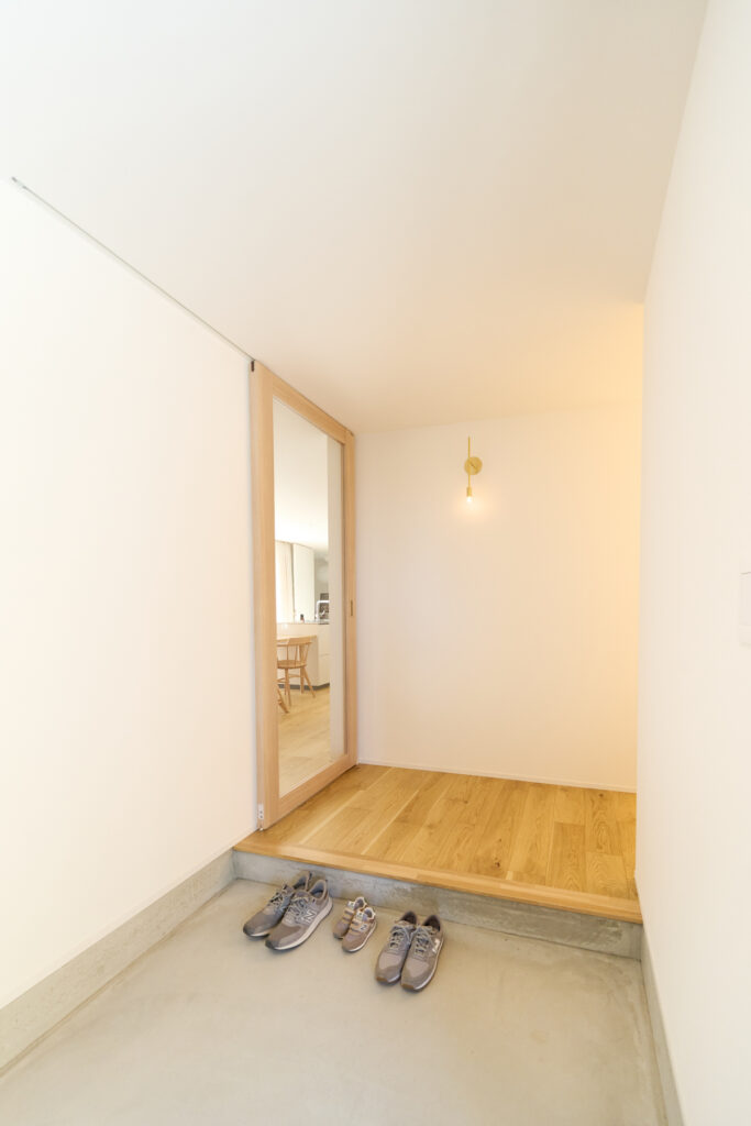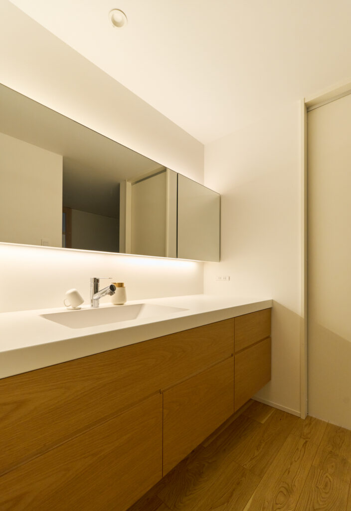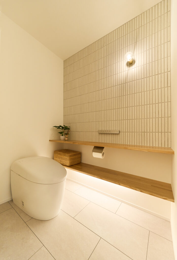 清潔感あふれる広々とした洗面コーナー、質感豊かなタイル壁と造作棚で設えたトイレ、木のぬくもりを感じる無垢フローリングの玄関。間接照明やペンダントのやわらかな光が空間を彩り、家族を優しく迎えてくれます。外観は、落ち着いたグレーの壁面と、あたたかみのある木目調ドアのコントラストが美しく、モダンで端正な佇まいです。