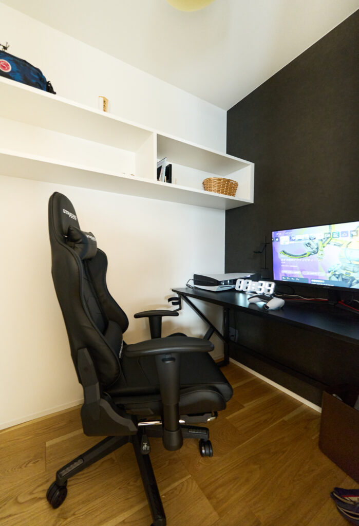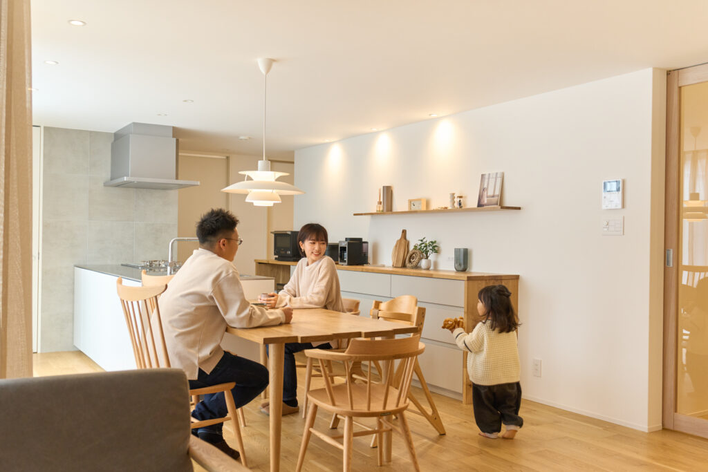 L字に配置されたLDKは、リビングとダイニングをゆるやかに分けながらも、家族の気配をいつも感じられる絶妙な距離感を保っています。木を張った天井がリビングに伸びやかな奥行きを与えています。リビングに隣接した書斎は完全個室で趣味や仕事に集中できる静かな場所になっています。