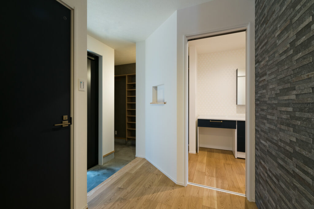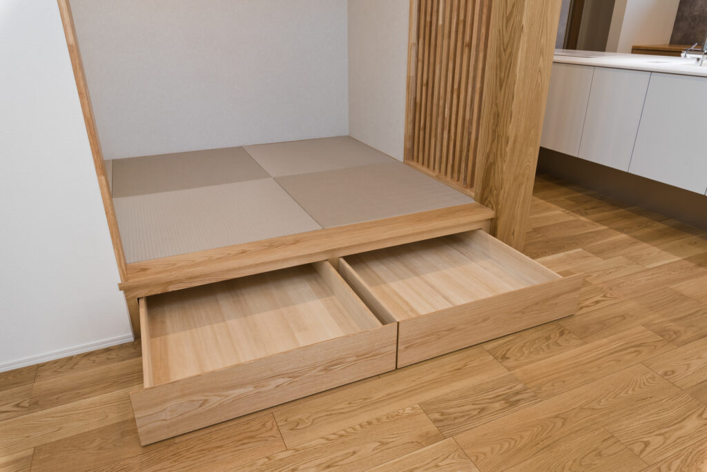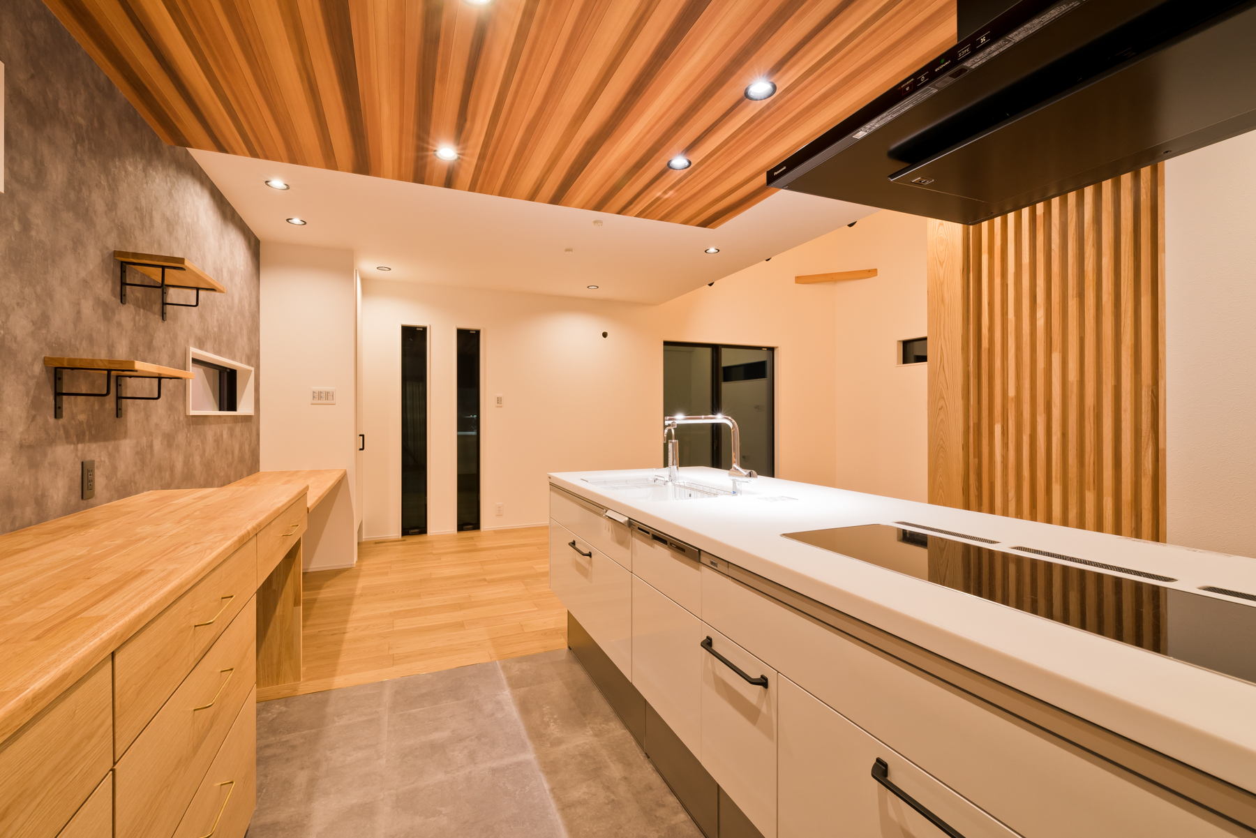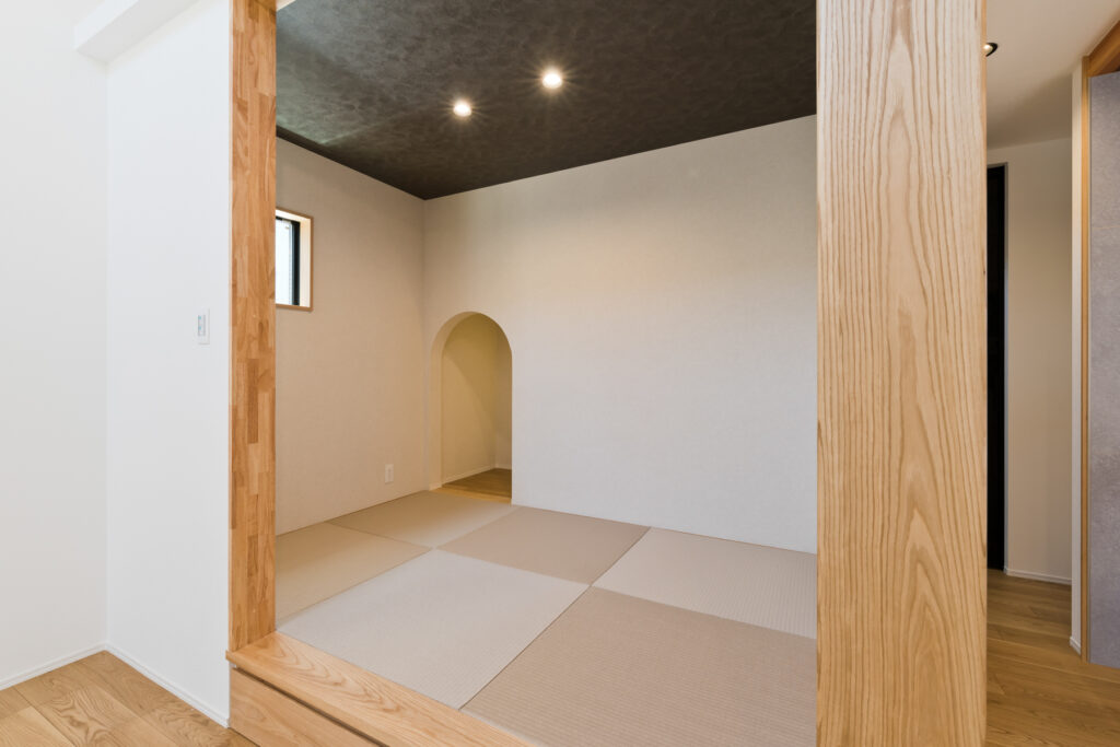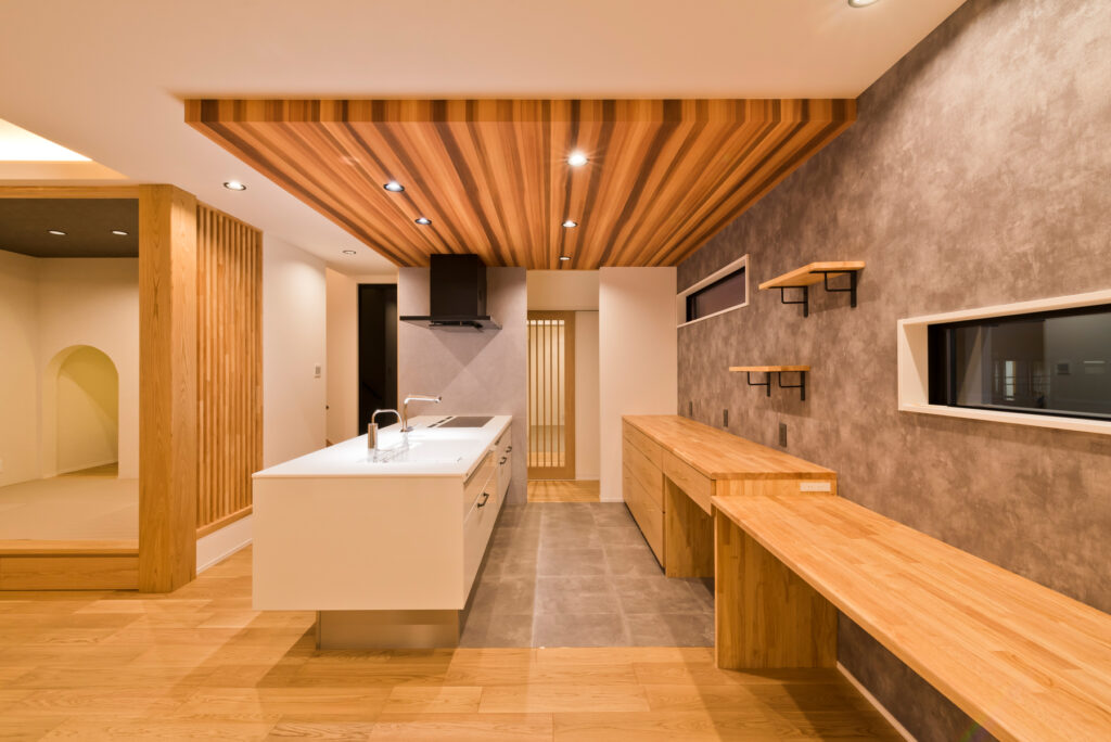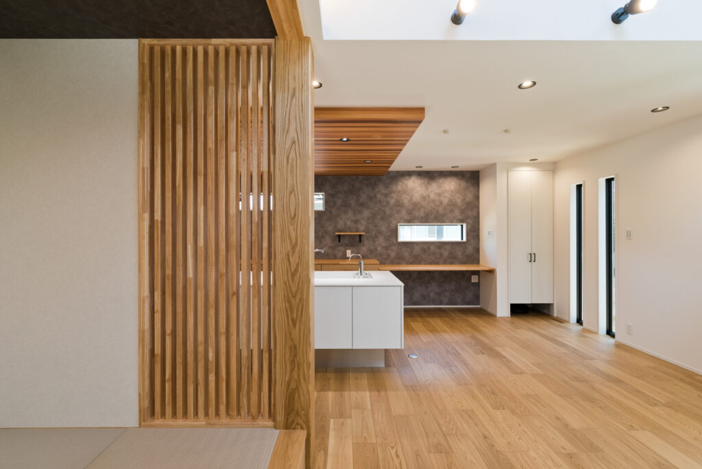 リビングに隣接する小上がりの畳は、思い思いに遊べる特等席です。おもちゃを広げても、すぐ横へ片付けられるため、散らかりを気にせず伸び伸びと過ごせます。キッチンから洗面へと一直線につながる配置が、朝の支度や洗濯物の整理をスムーズにしています。