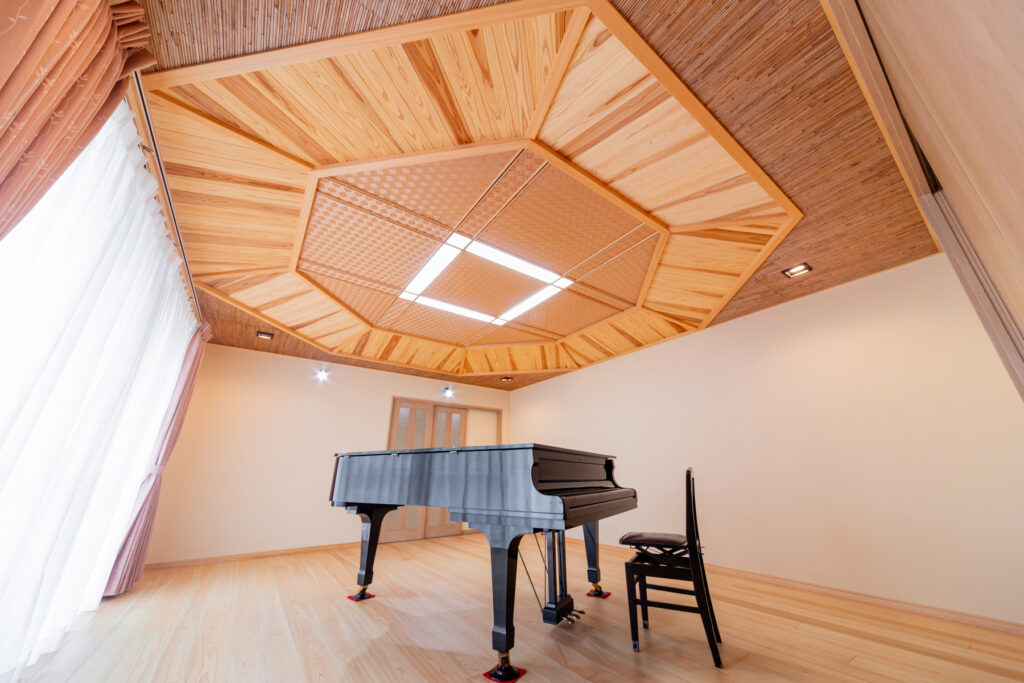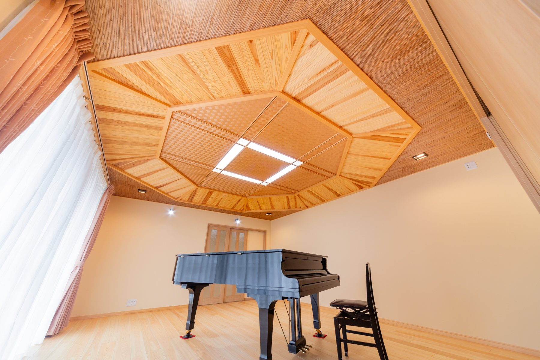 施主の夢が結実した15帖の洋室は、グランドピアノのための特別なホールです。全て本物の木で手作りした八角形の造作天井が空間に個性を与え、埋め込み照明が柔らかな光で室内を満たします。職人の技術が隅々まで行き届いたこの部屋は、音楽を奏でるたびに豊かな響きを生み出し、演奏する喜びを一層深めてくれます。