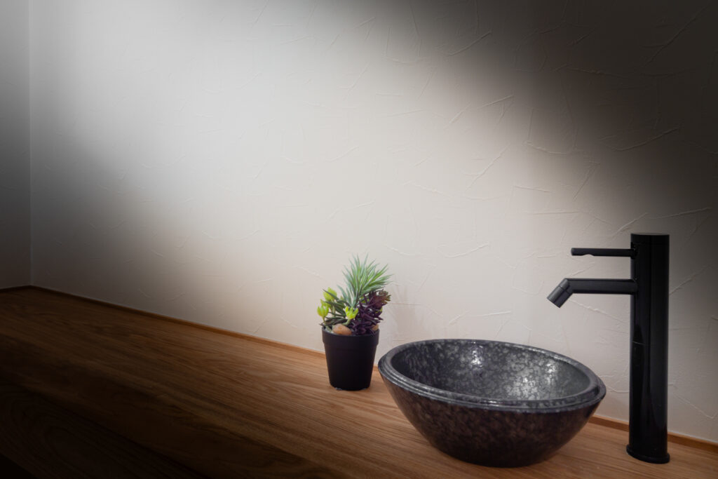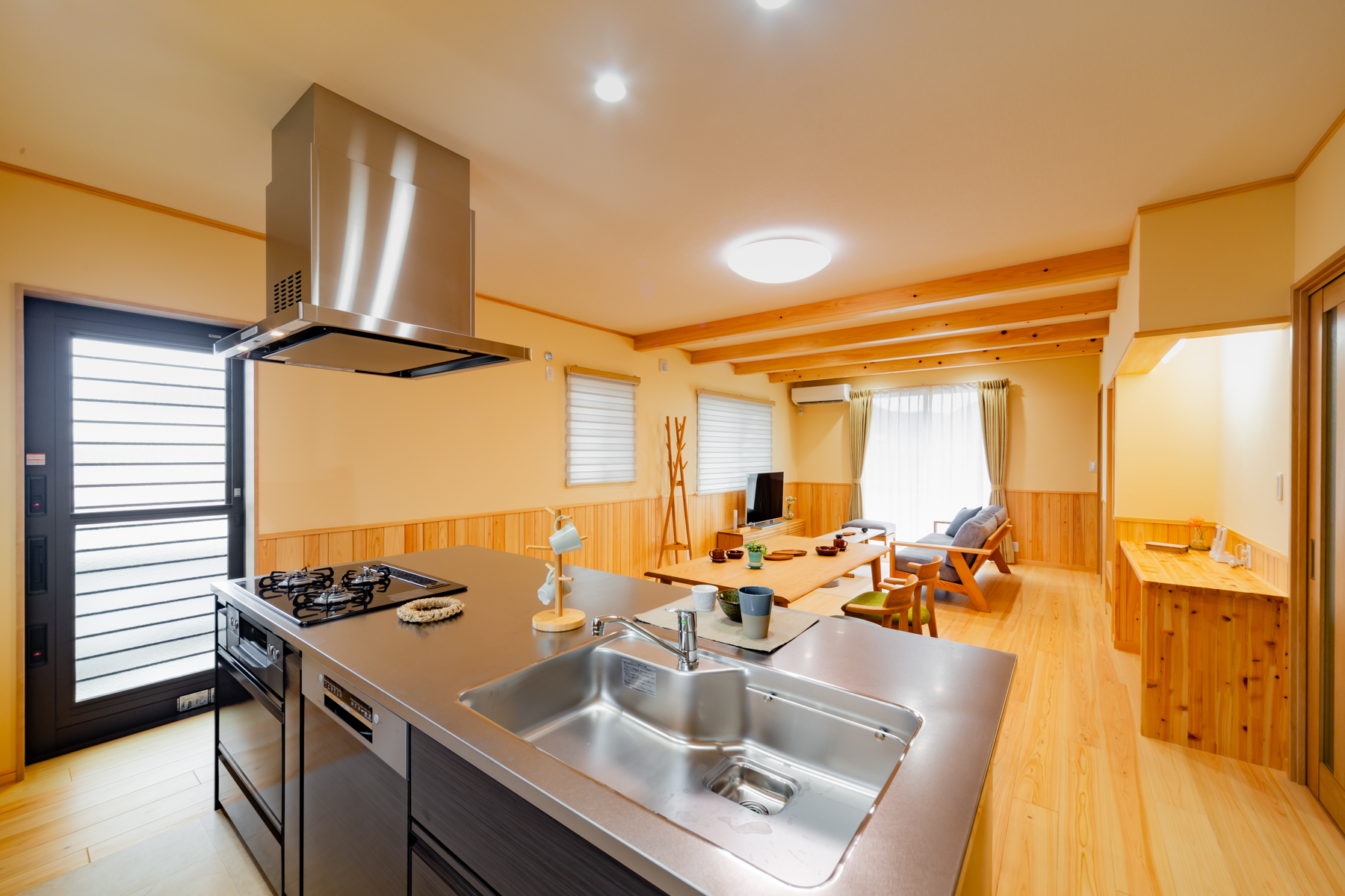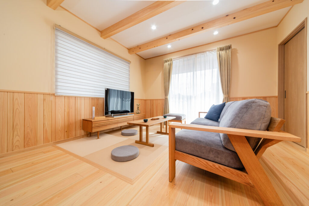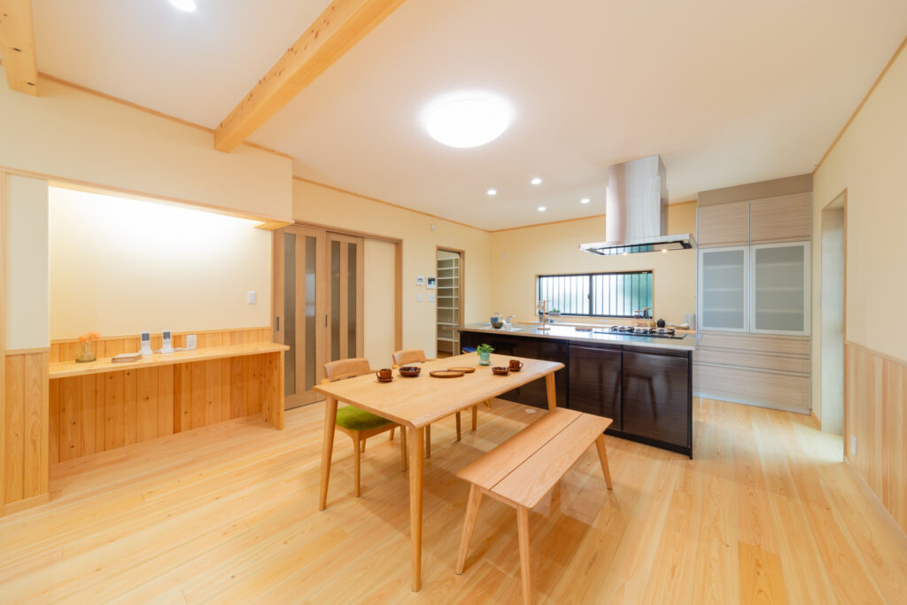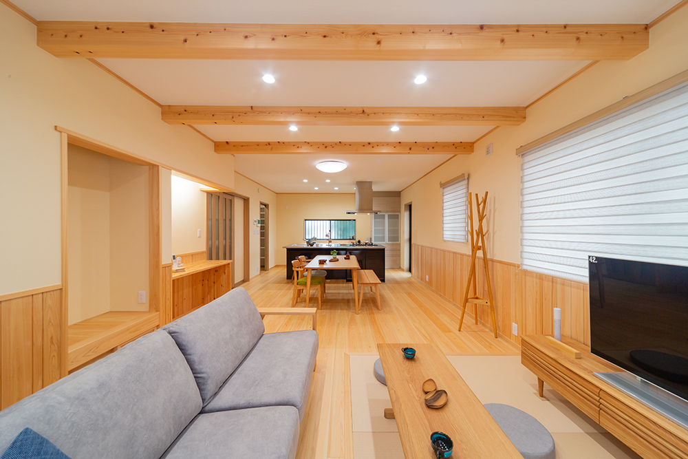 LDKではヒノキの腰壁と化粧梁が、木のぬくもりを存分に感じさせるジャパニーズモダンスタイルを実現しています。リビングに架かる化粧梁は視線を奥へと誘い、空間に立体的な広がりをもたらします。職人が妥協なく仕上げた伝統的な美しさと現代的なデザインが調和し、「和」の風格を静かに醸し出す居住空間となっています。