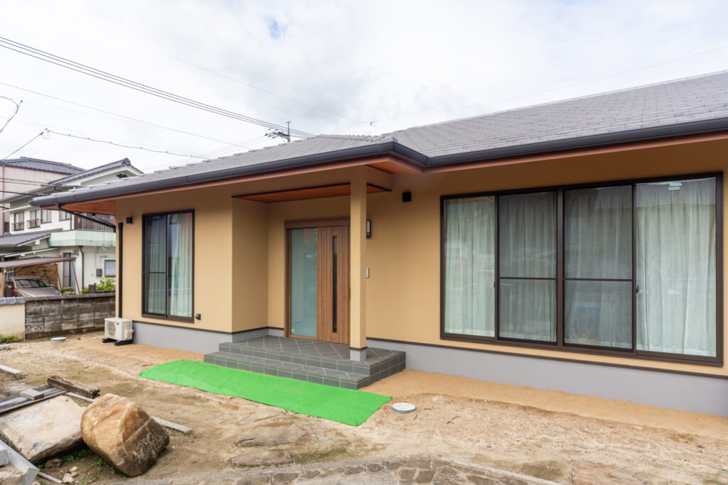 深く張り出した軒が印象的な外観は、塗り壁仕上げによって端正な表情を見せています。無垢のヒノキをぜいたくに使用した室内では、自然素材ならではの芳香が満ち、訪れる人を穏やかに迎え入れます。57坪という広々とした延床面積を持つこの平屋は、ゆとりある動線と機能的な配置によって、日々の生活に上質な時間をもたらしています。