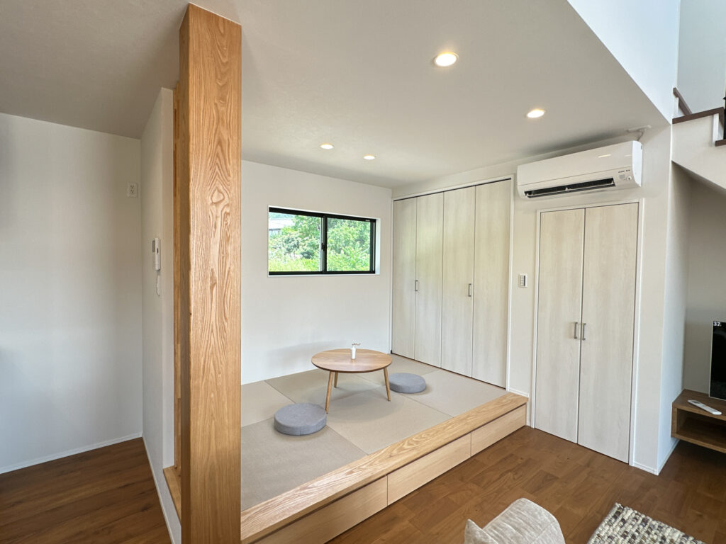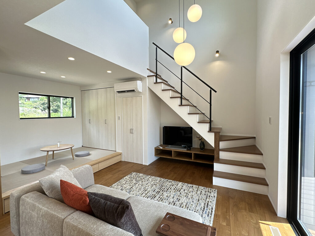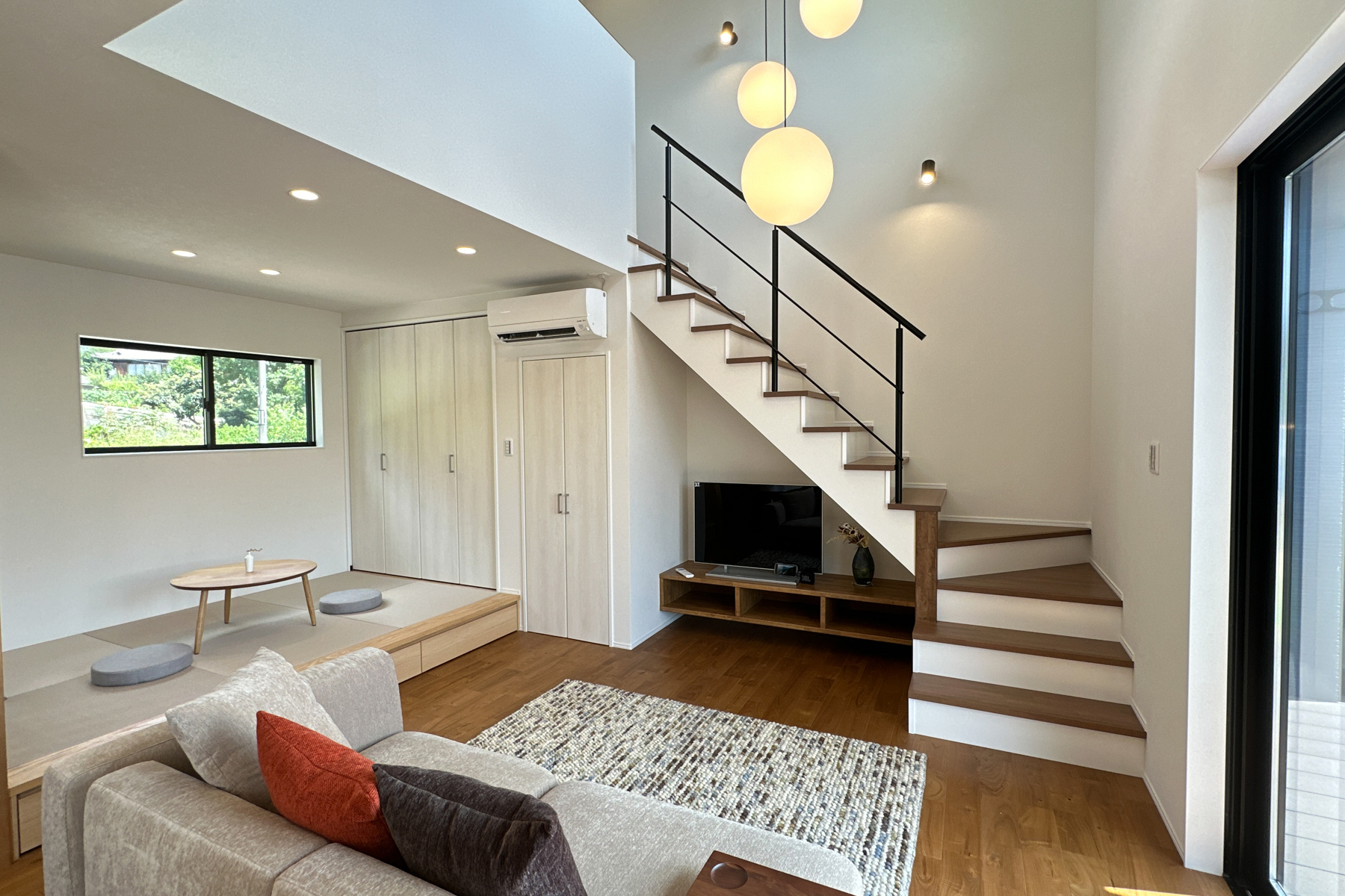 天井高のある居室は、上下階をゆるやかにつなぎ、空間全体に明るさをもたらします。視線が上へと抜けることで、実際の面積以上の広がりを感じられる設計です。家族が自然に集まる場所として、日々の時間を包み込みます。立体的な構成が、暮らしに奥行きと変化を生み出しています。
