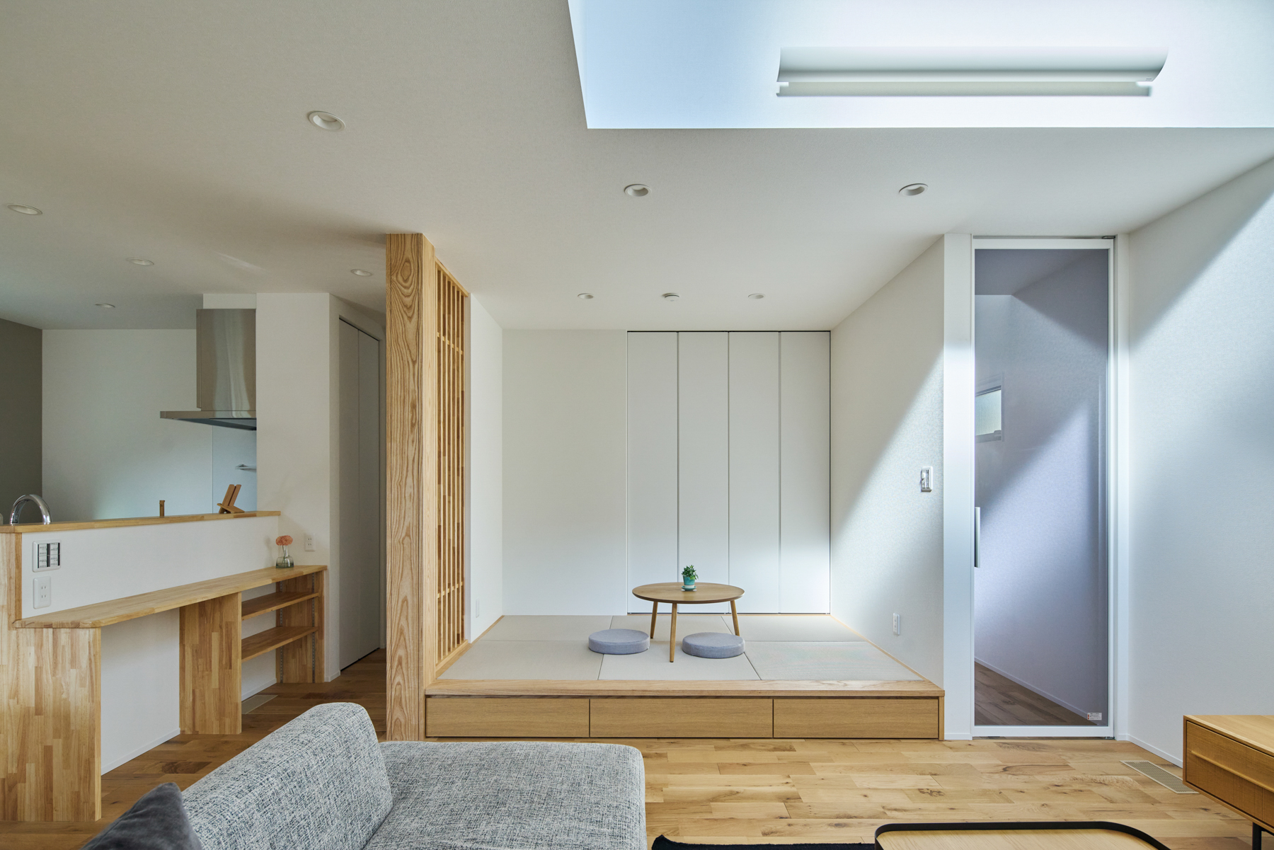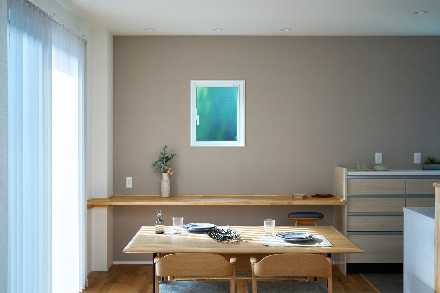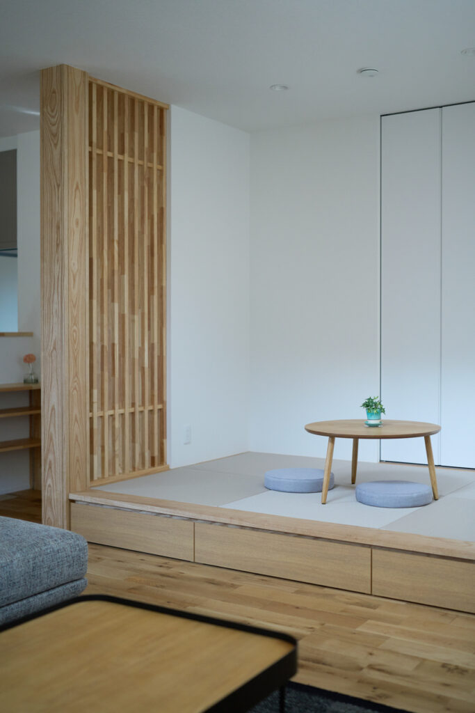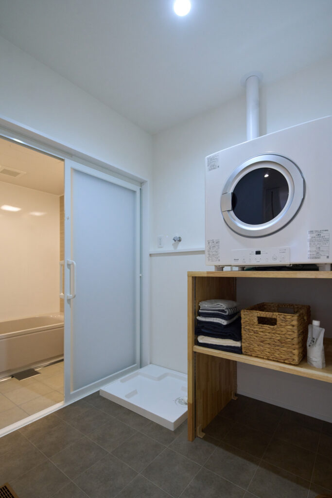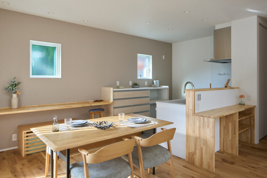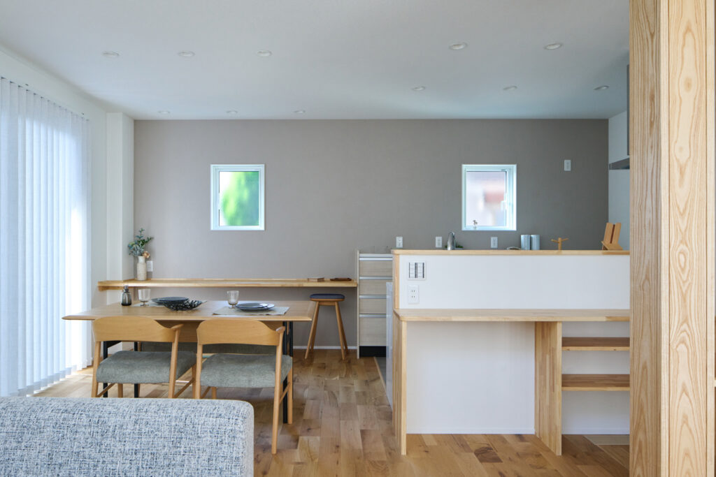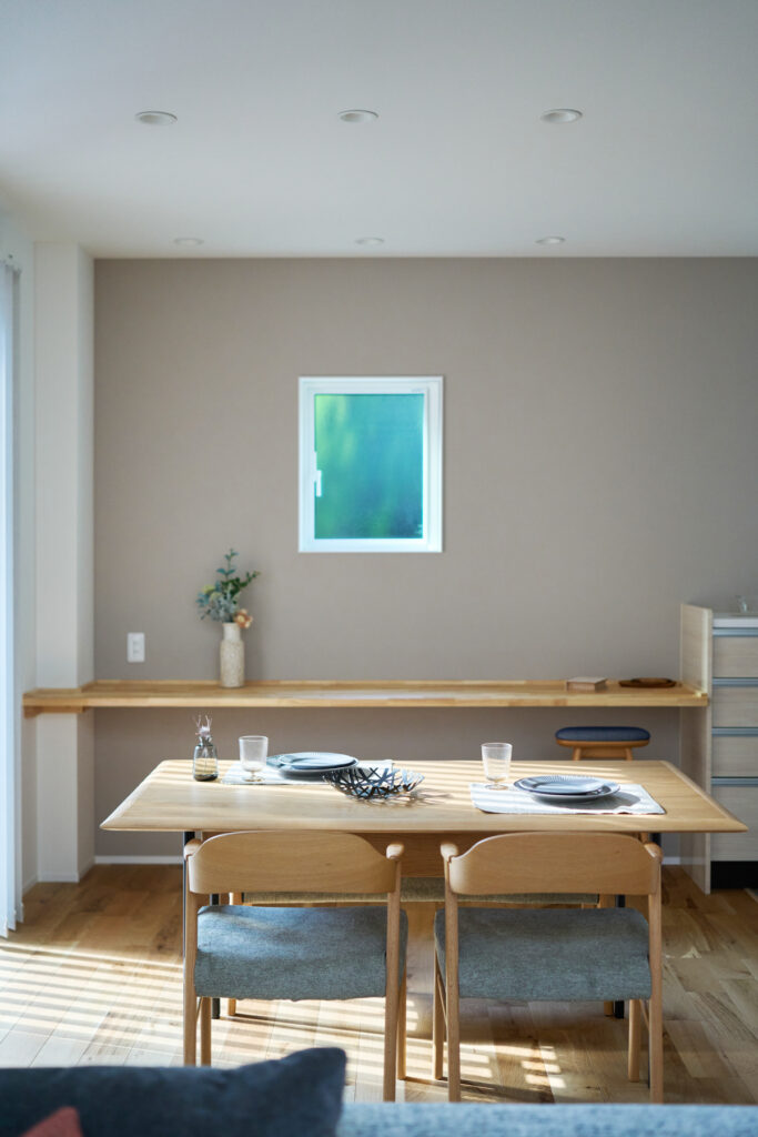 歴史ある会社であること、自社大工を抱えていること、事務所の雰囲気から感じられる安心感。複数社を検討したYさんが最終的に「坂本工務店」を選んだ理由は、一緒に考えながら家づくりを進められる姿勢でした。カウンター下に設置した床下エアコンが邸内全体を足元から暖め、無垢床のぬくもりと相まって帰宅時にほっとする心地よさを生み出しています。共働きを支えるガス衣類乾燥機の設置台も大工の手造りです。