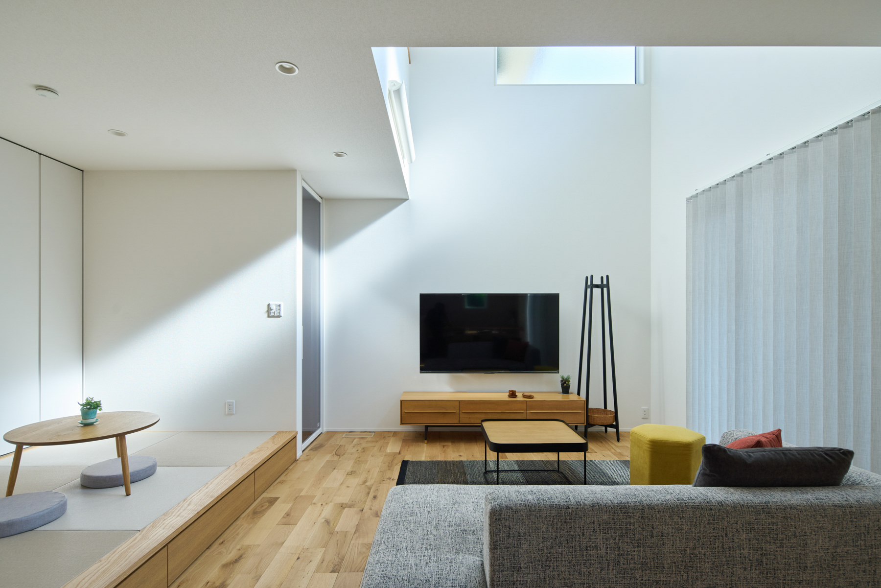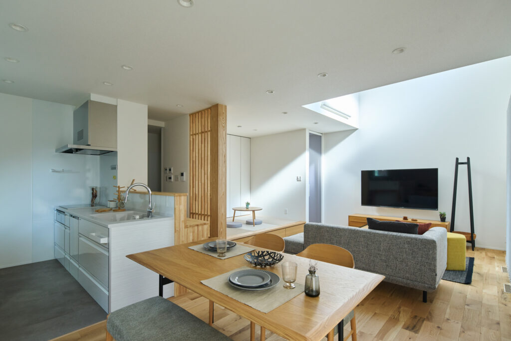 祖父母から譲り受けた土地を活用すべきか、新たに購入すべきか。悩みを抱えていたYさんに、「坂本工務店」はすぐに現地へ足を運び、土地を生かすメリットを具体的に提示しました。南側の敷地が高くて日当たりに不安があった立地でも、日射シミュレーションで最適な窓配置を設計。吹き抜けと南東の大開口で冬は光と熱を取り込み、夏は軒の出で日射を調整する計画により、北側道路でも明るい住環境を実現しています。