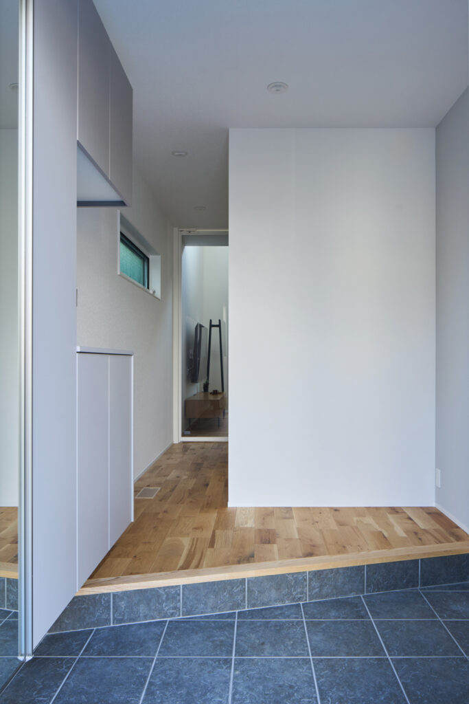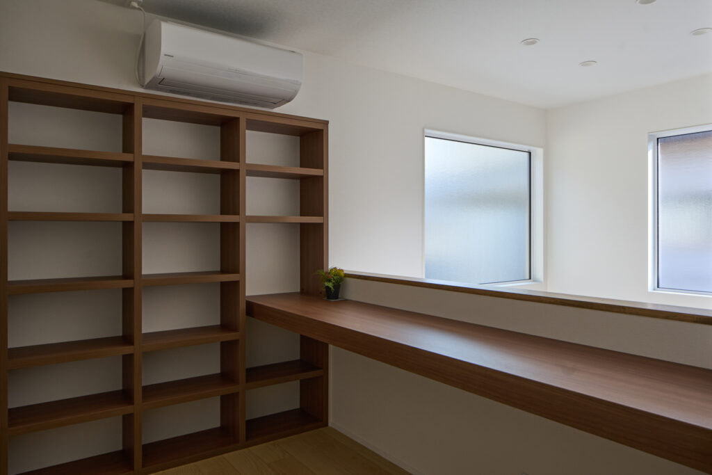 デザインも重要ですが、何より住み心地や安心感、性能を優先した結果、悩んで選んで完成した家は唯一のものになりました。小上がりの引き出し収納、天井高を確保したハイドア、吹き抜けに面したスタディーコーナーの造作本棚。リビングへ続くガラス入りハイドアが明るさと奥行きを生み出し、ご主人が選んだ青い外壁が個性を静かに主張する佇まいです。外張り断熱による高い保温性能が、一年を通じて快適な温熱環境を支えています。