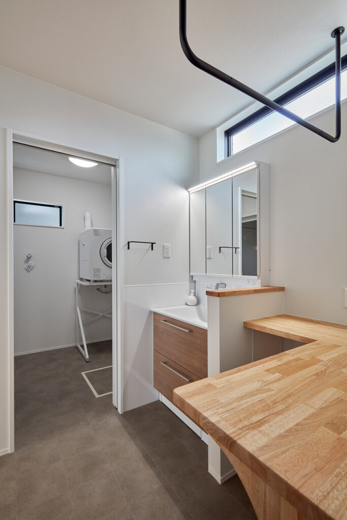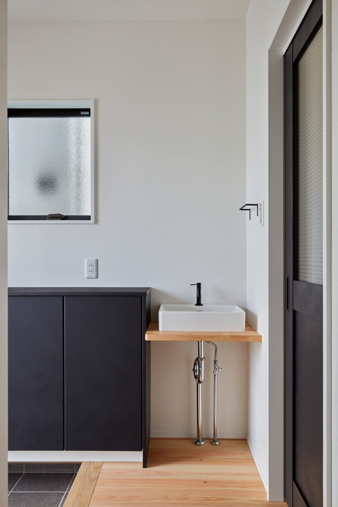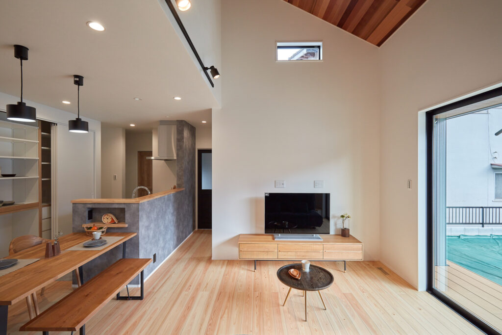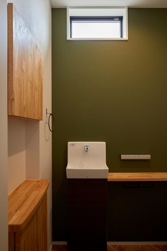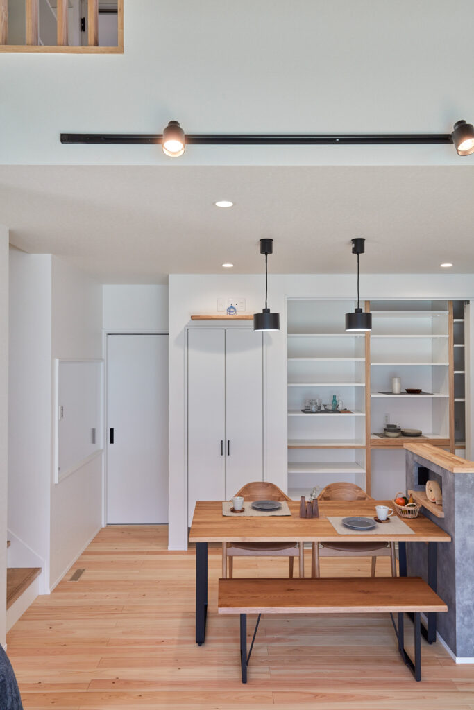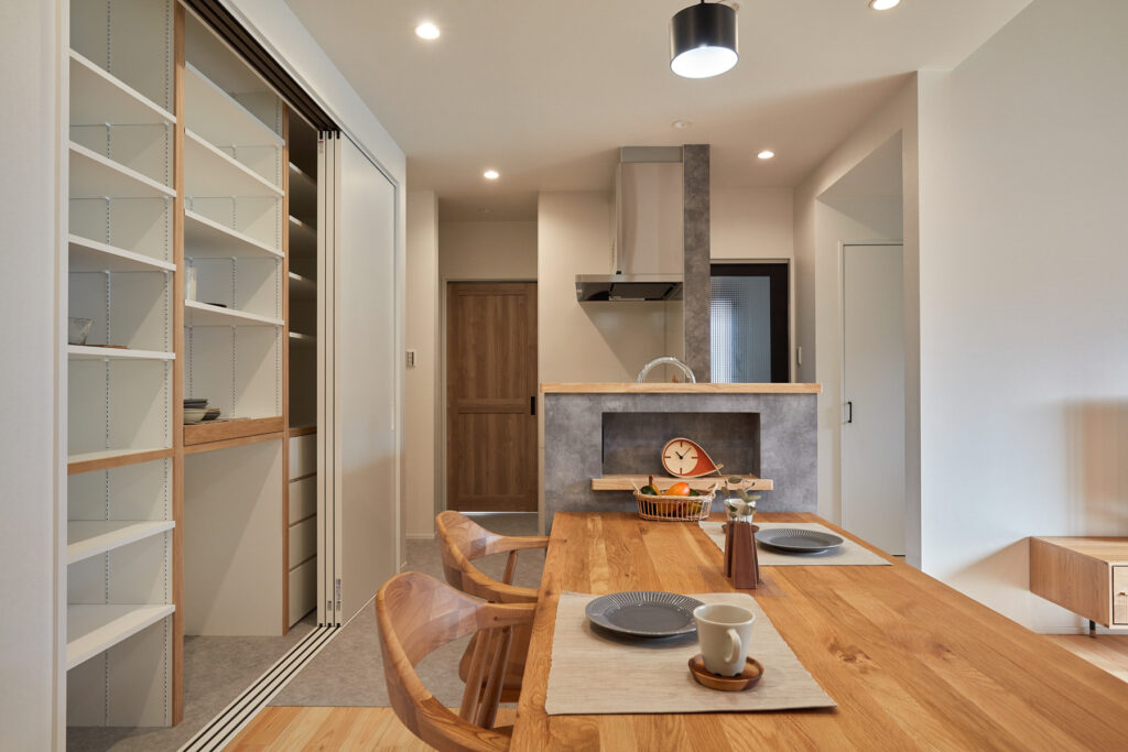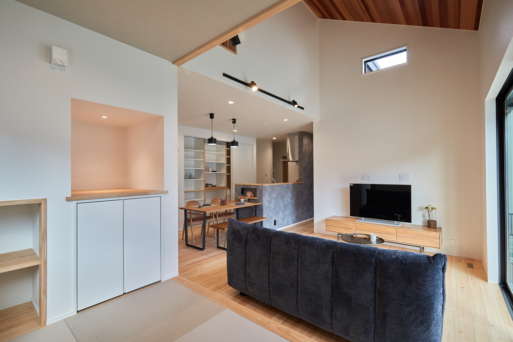 パッシブデザインに基づき、軒の出を深く設計。床はヒノキの光触媒フローリング、天井はレッドシダー仕上げで、自然素材の質感が呼吸する室内環境を実現しました。玄関横には手洗い器を造作し、帰宅後すぐに手を清められる動線を確保。収納は引き戸で隠せる仕様にし、パントリーの下にはロボット掃除機の基地を設け、壁にパネルを埋め込んで家族の伝言板として活用しています。