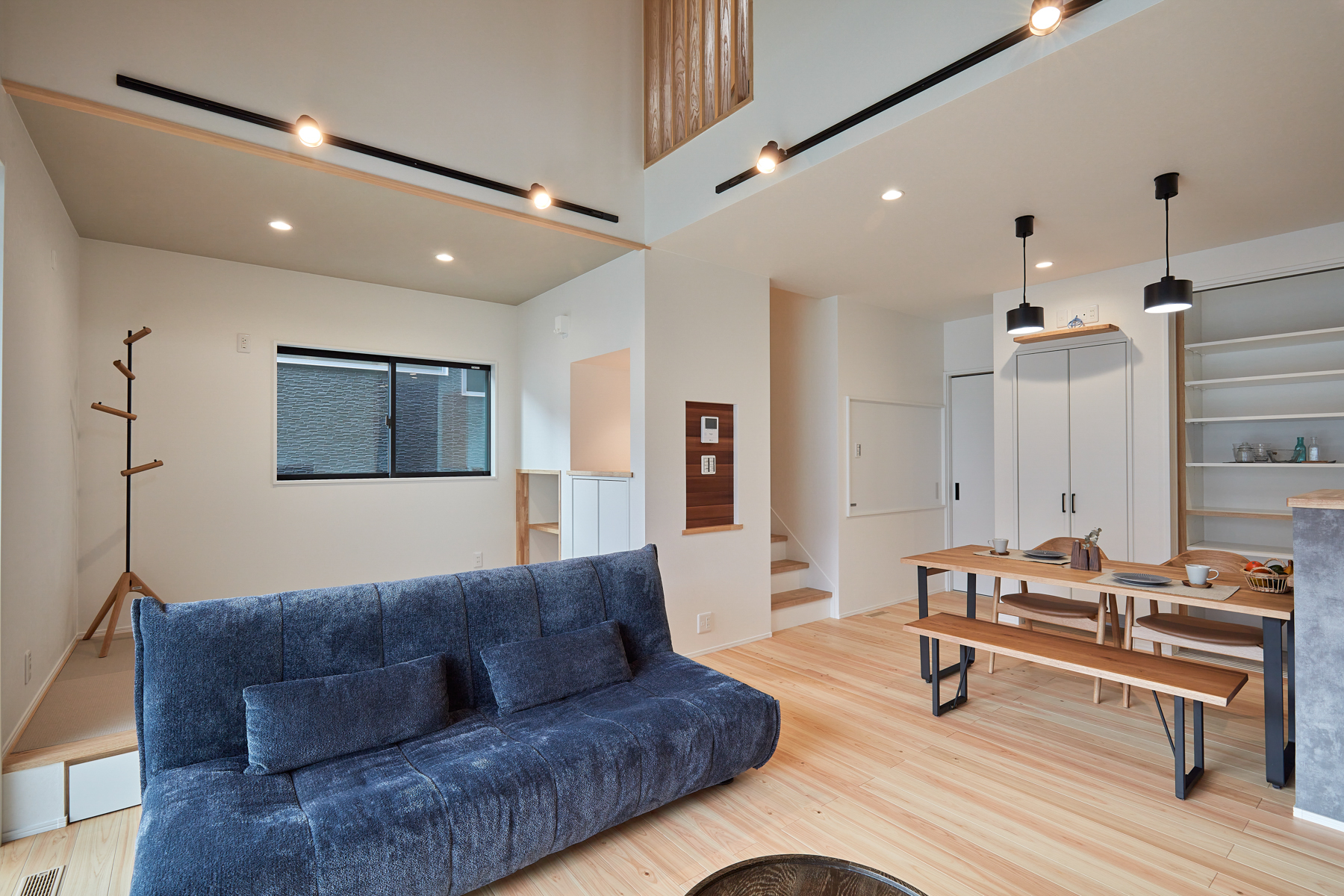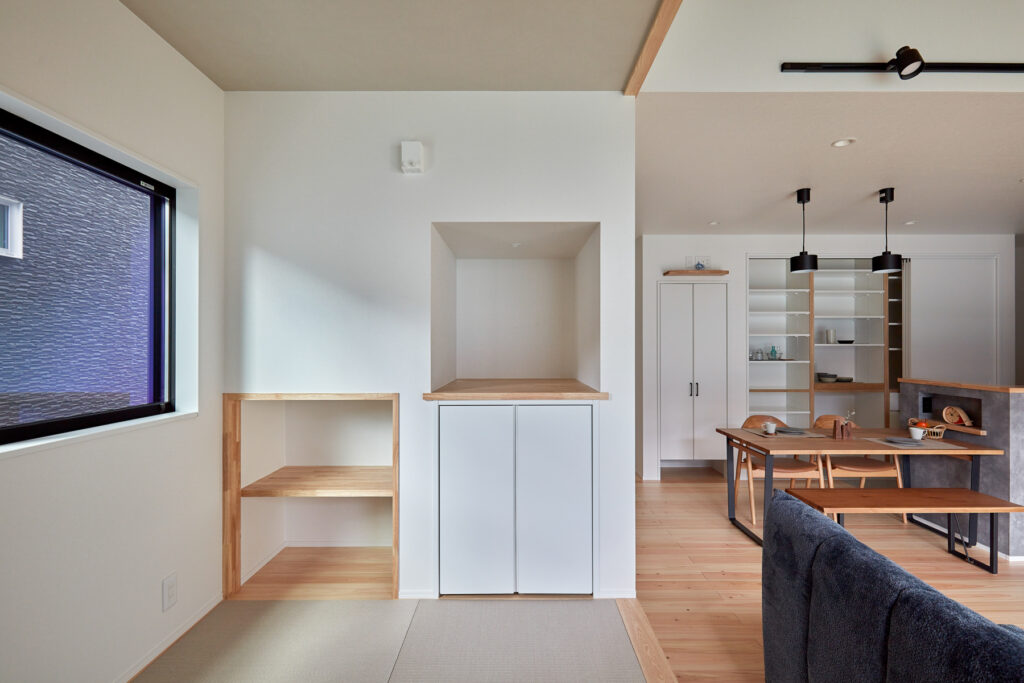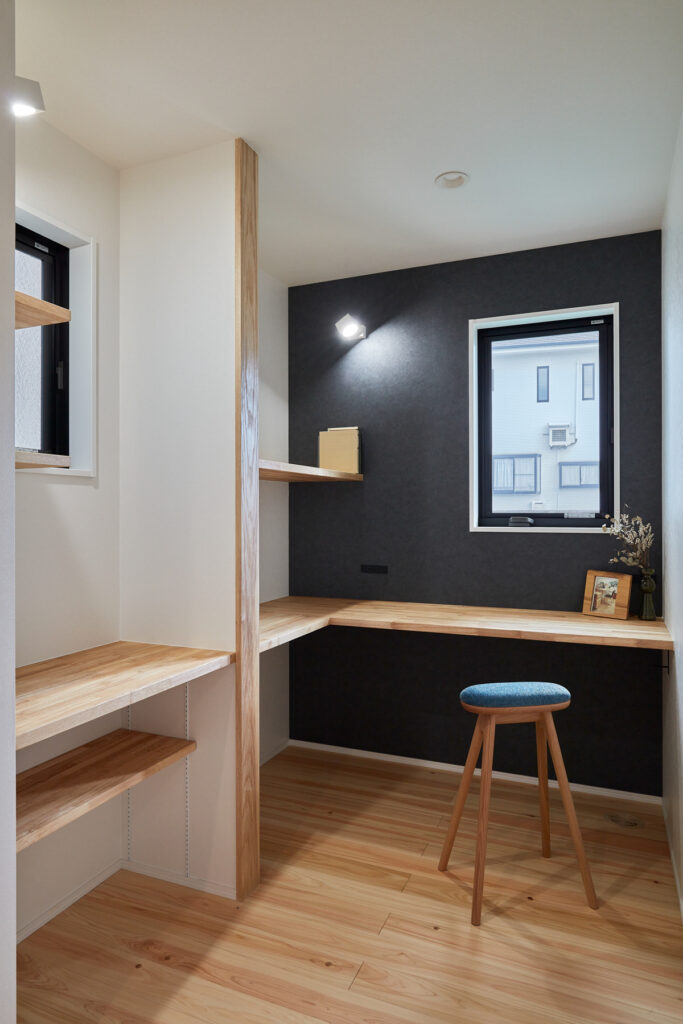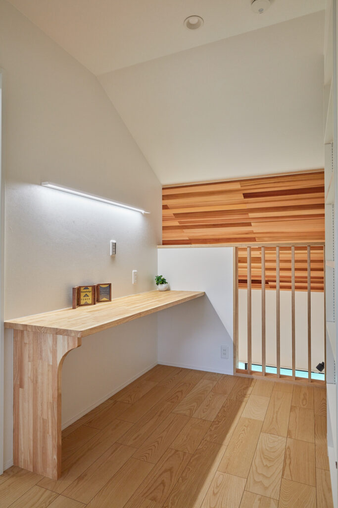 書斎はキッチンから様子が伺える位置に配置し、2階のスタディースペースは吹き抜けを介して家族の存在を感じられる設計です。小上がりの畳スペースにはお雛さまを飾る棚を設け、おもちゃの収納場所も確保しました。家事動線や収納、書斎、スタディースペースなど、希望を詰め込んだすてきなお家です。