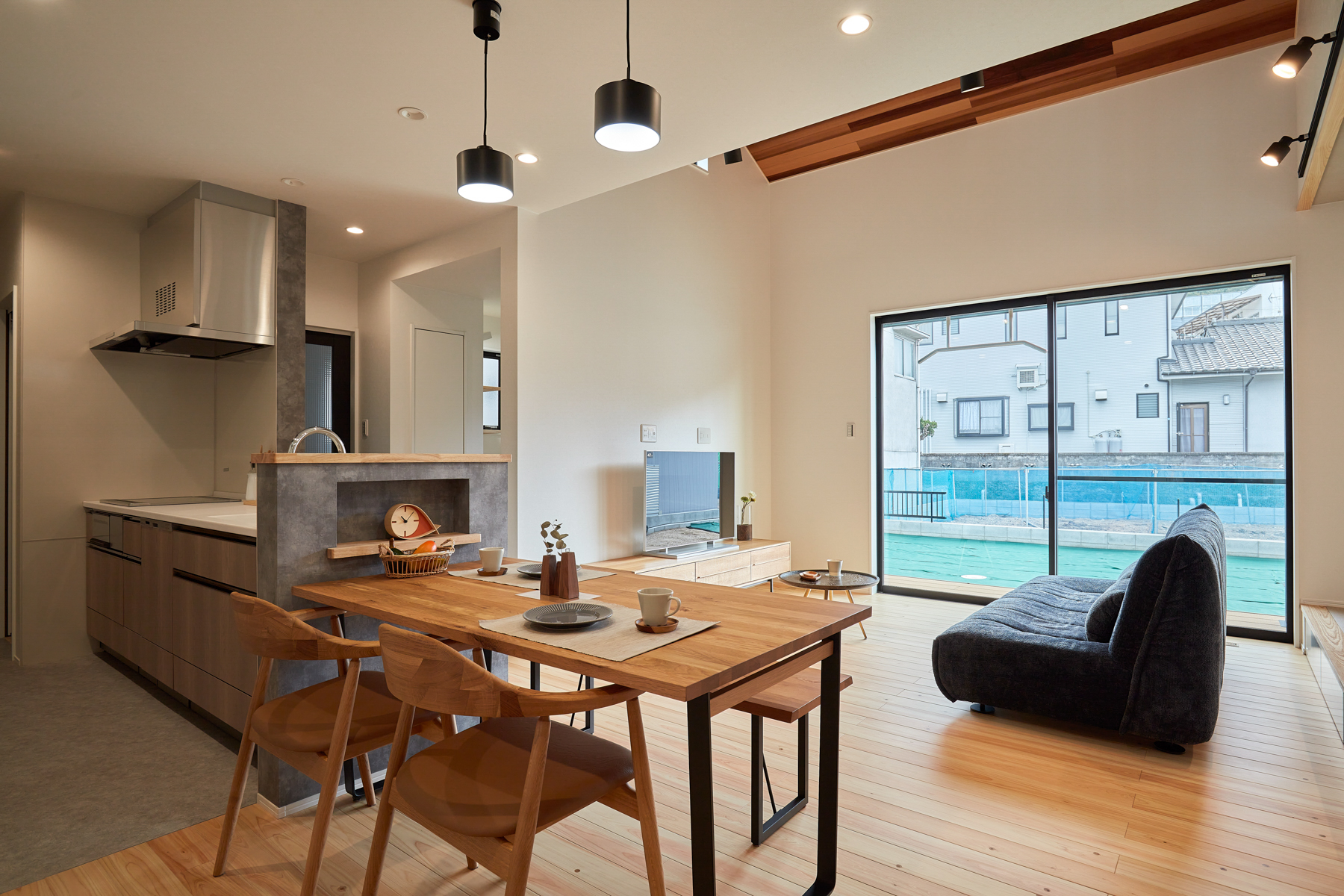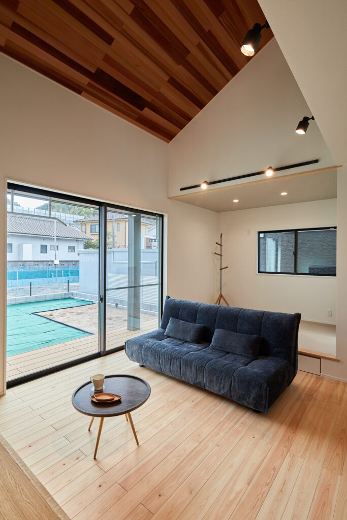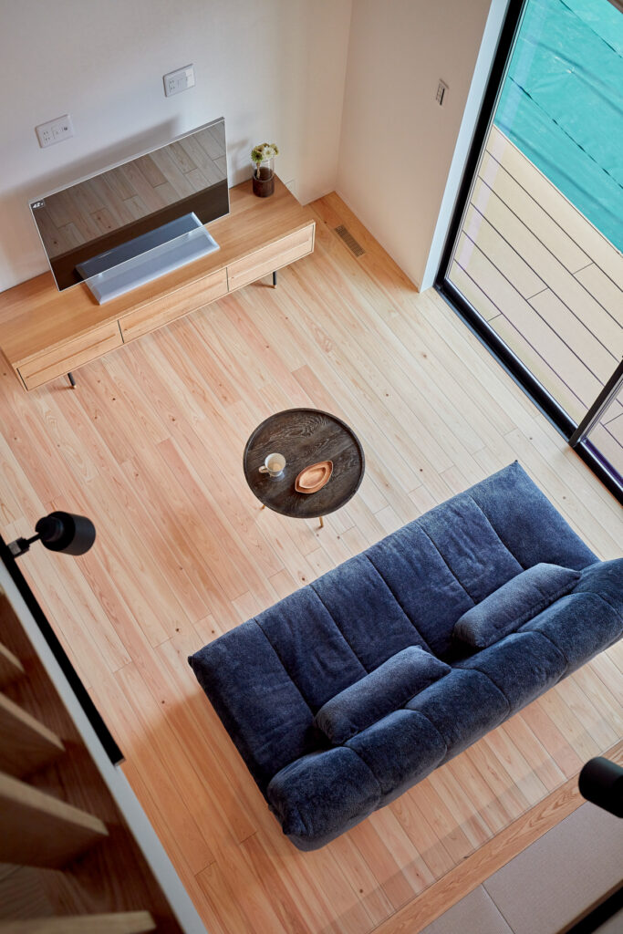 当初はリノベーションと新築で迷っていたOさんご夫妻。知識が豊富で大工の技術が高い会社を求め、「坂本工務店」との出会いが実現しました。VRを駆使した打ち合わせを重ね、間取りは寸法を細かく刻むことでゆとりのある空間を確保。1階に寝室やクローゼットを設けて2階をコンパクトにまとめ、大屋根を掛けて平屋のような佇まいに仕上げました。