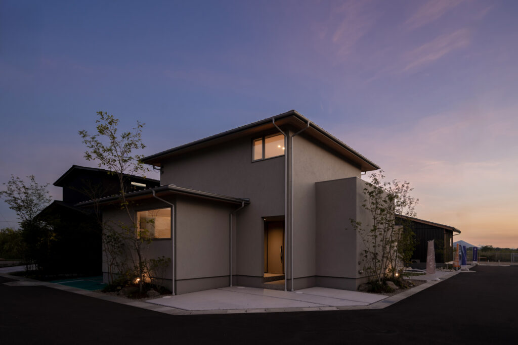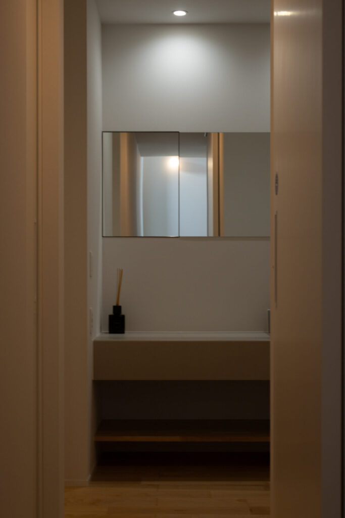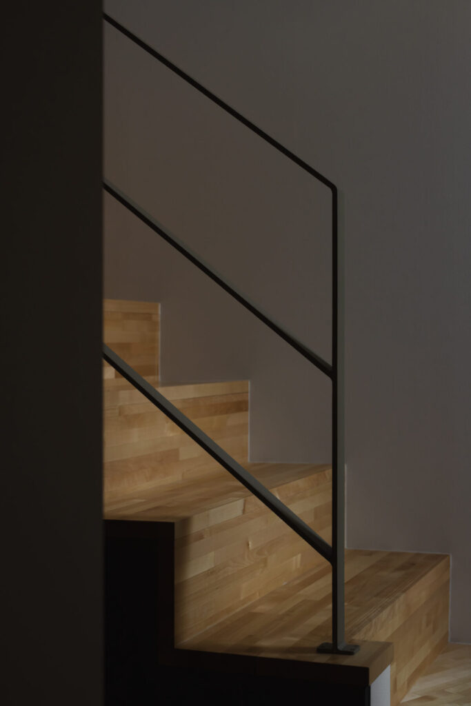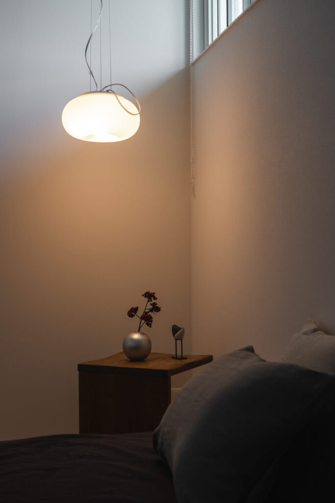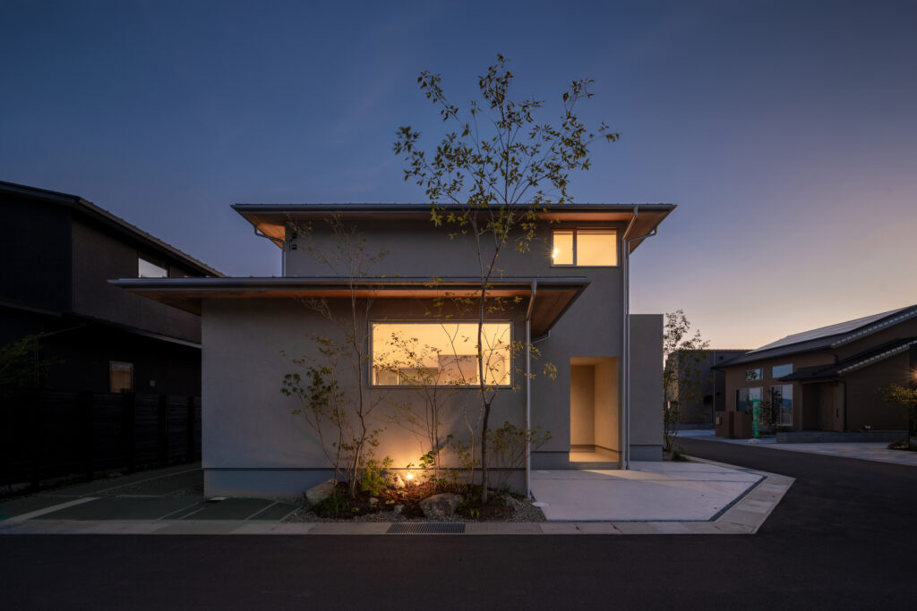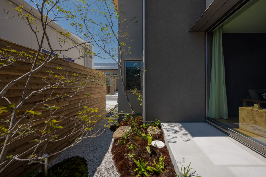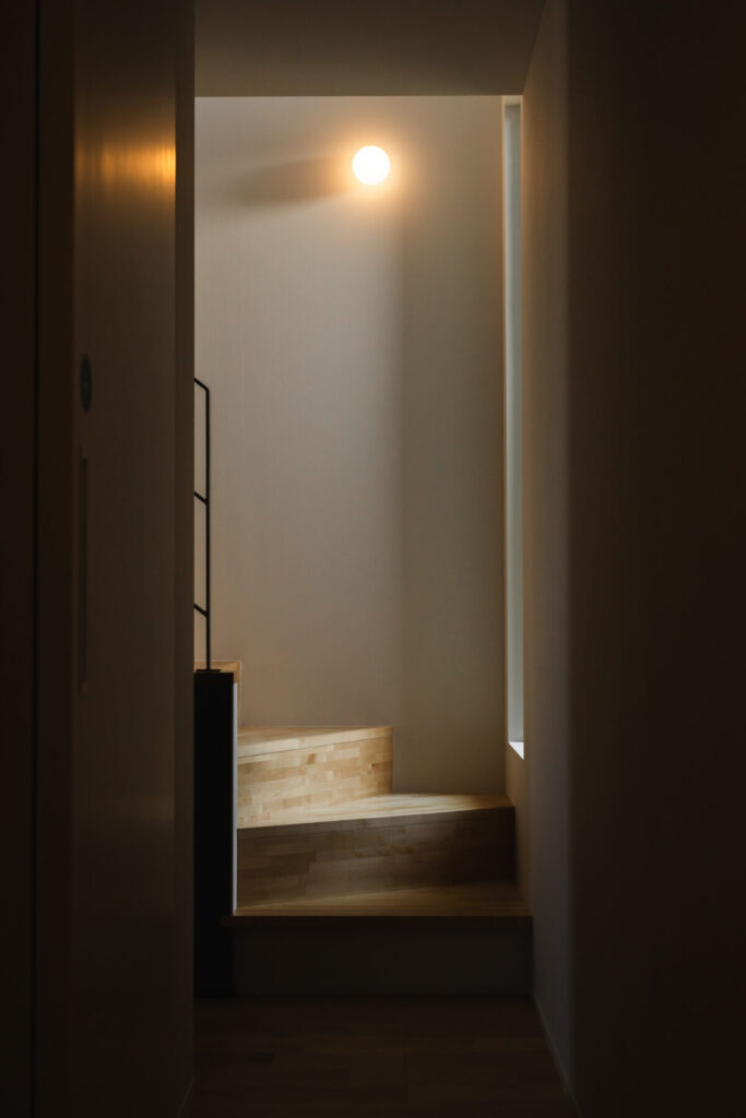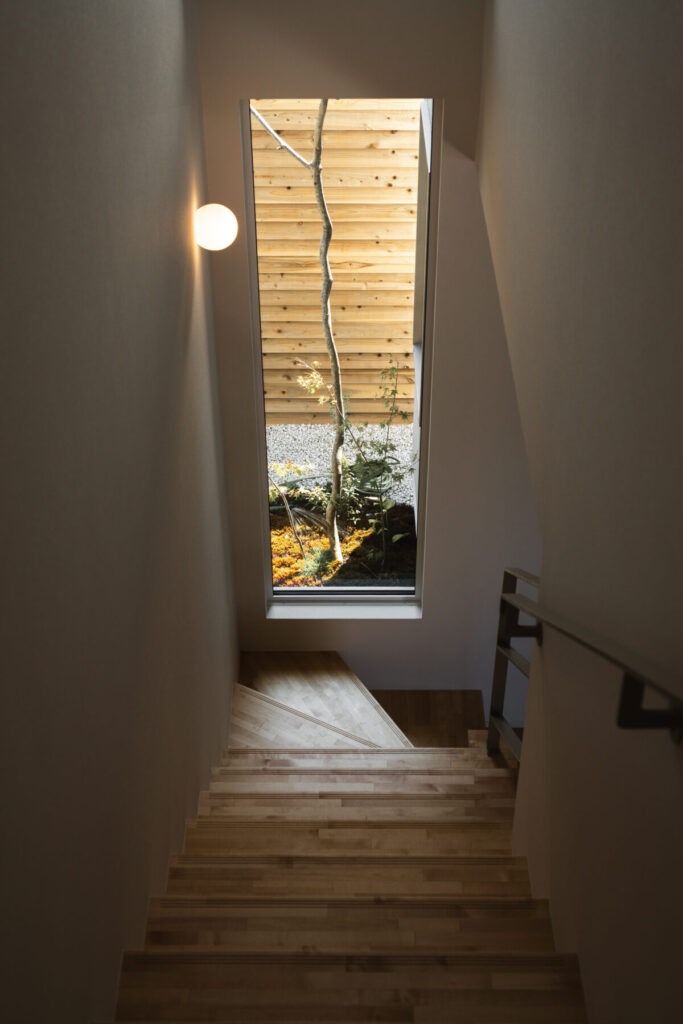 階段ホールには縦長の窓を設け、時間帯によって変化する光と影が印象的な表情を生み出します。上下階の移動にも自然の光と緑が寄り添い、住まい全体に奥行きと広がりをもたらします。外観は二方道路に対して異なる表情を持ち、街並みにも静かな存在感を放っています。