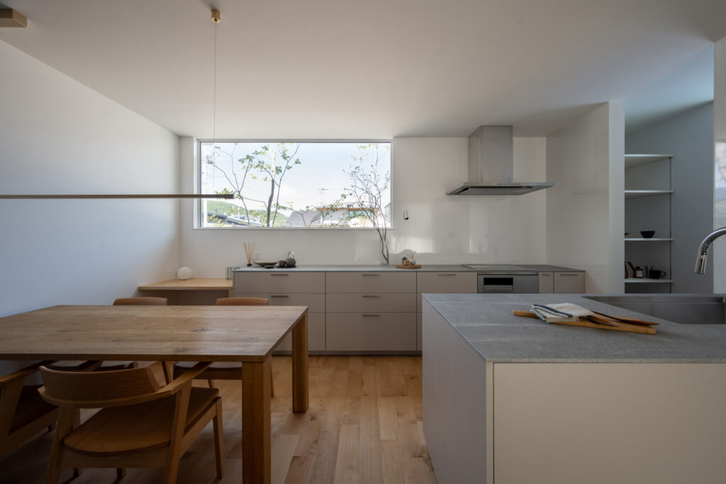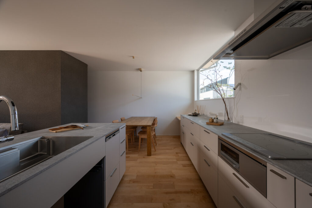 キッチンはダイニングとゆるやかにつながり、家事動線を最適化。大きな窓からは外の緑が望め、作業中も自然の気配を感じられます。収納や作業スペースも充実し、家族のコミュニケーションが自然と生まれる設計。シンプルな意匠と素材感が、日常に上質なアクセントを加えています。
