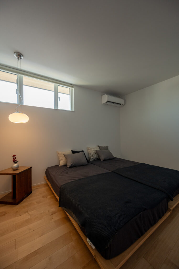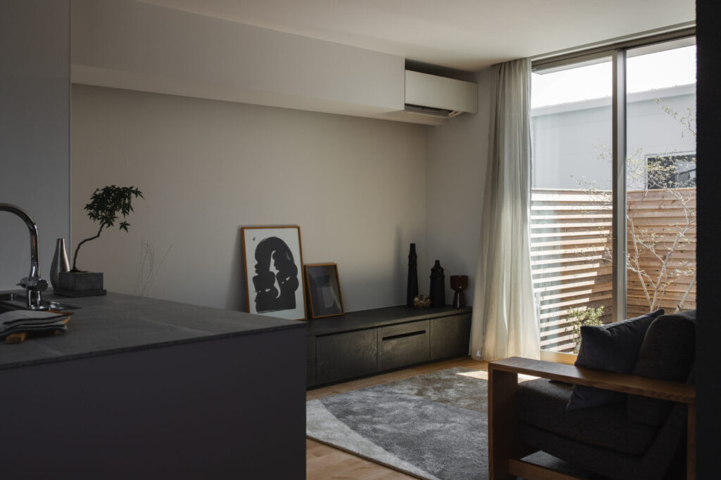 北東の大きな窓から朝日が差し込み、やわらかな光が室内を包みます。二方道路の敷地条件を生かし、開く場所と閉じる場所を巧みに設計。リビングは囲まれた庭と自然につながり、家族だけの時間を大切にできる落ち着いた住環境を実現しています。窓越しに広がる植栽の景色が、日々の暮らしに四季の移ろいを添えます。