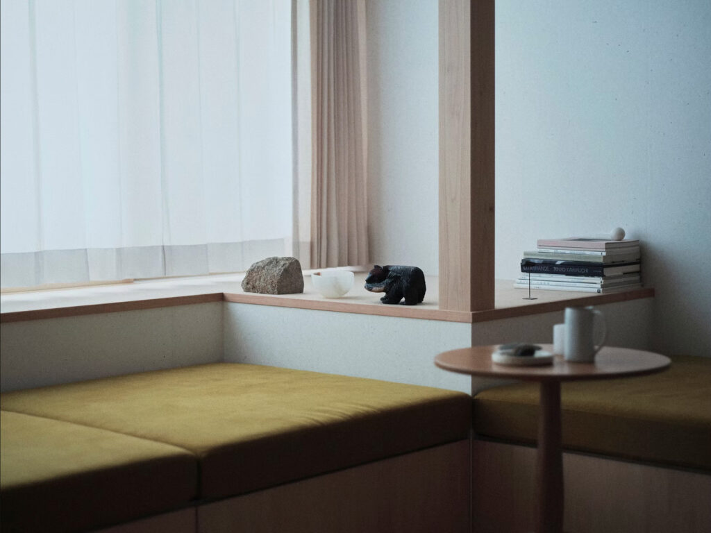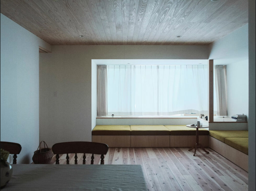 窓辺に沿って設えたベンチソファが、家族の憩いの場となっています。