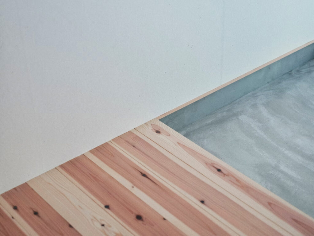 杉材の床と土間のコントラストが、素材の魅力を引き立てます。