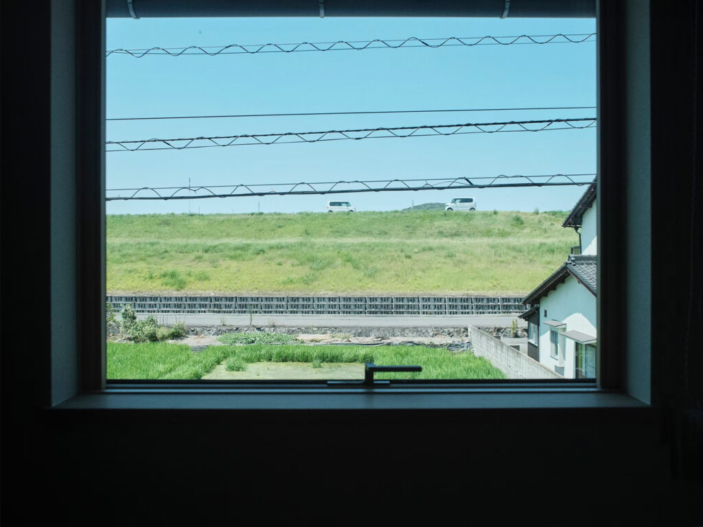 窓越しに広がる堤防の緑が、室内に季節の移ろいをもたらします。