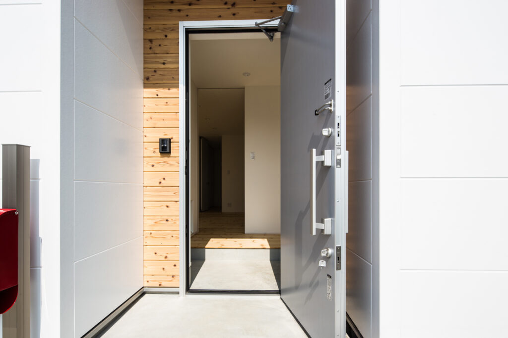 外観は白く塗装されたサイディングと片流れ屋根が特徴です。玄関周りにはモルタル仕上げを採用し、直線的なフォルムが街並みに映えます。余計な装飾を排したシンプルなデザインが、周囲の環境と調和しながらも個性を際立たせています。玄関ドアの赤いポストがアクセントとなり、訪れる人をやさしく迎え入れます。