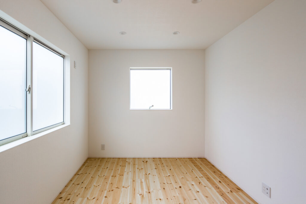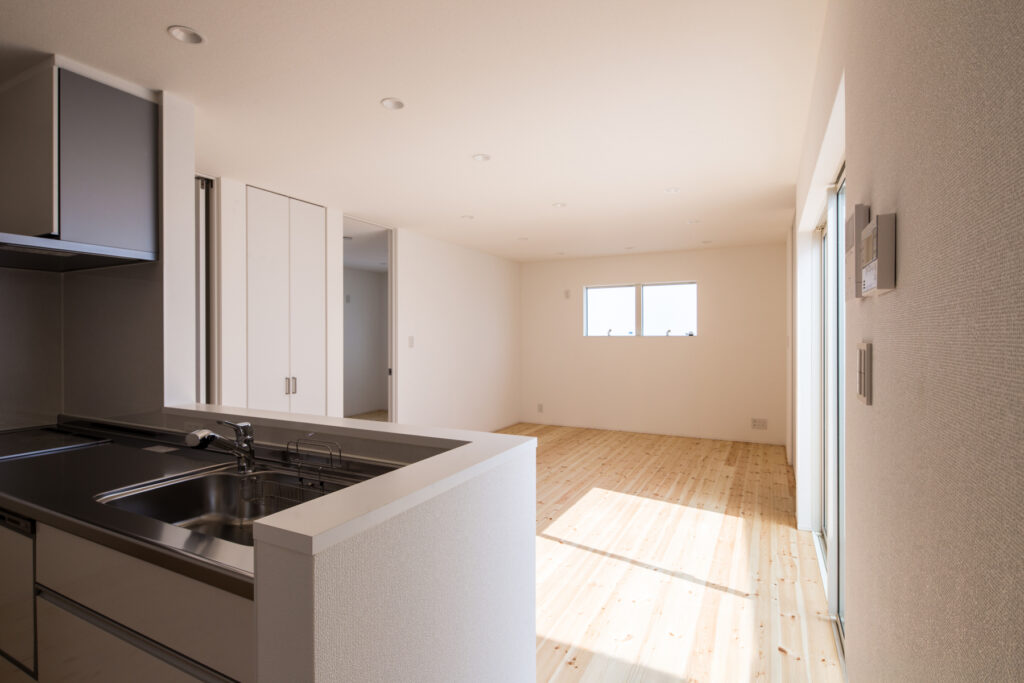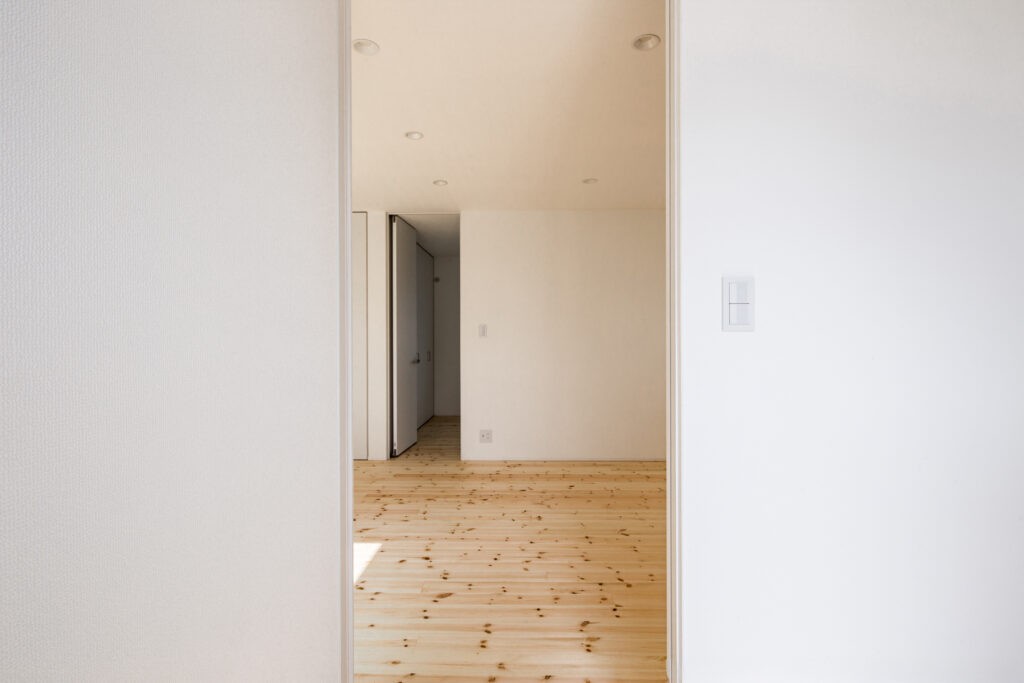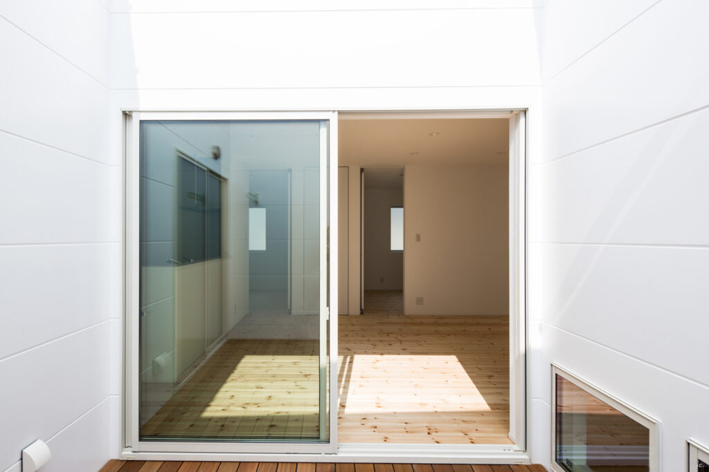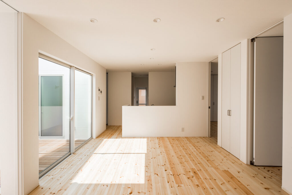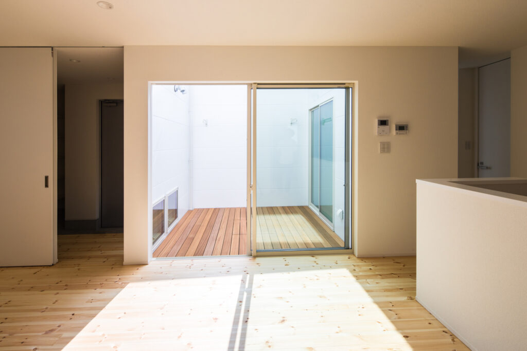 室内は無垢材のフローリングが広がり、素足に心地よい質感をもたらします。天井まで届くハイドアを採用し、視線が抜けることで圧迫感を感じさせません。リビングと中庭をつなぐ大きな窓からは自然光がたっぷりと入り、日々の生活にやわらかな明るさをもたらします。収納や建具も白で統一され、清潔感が漂います。