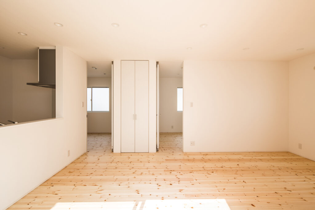 無垢材の床とハイドアが生む開放感