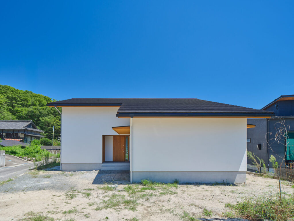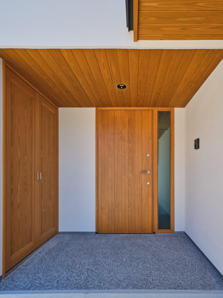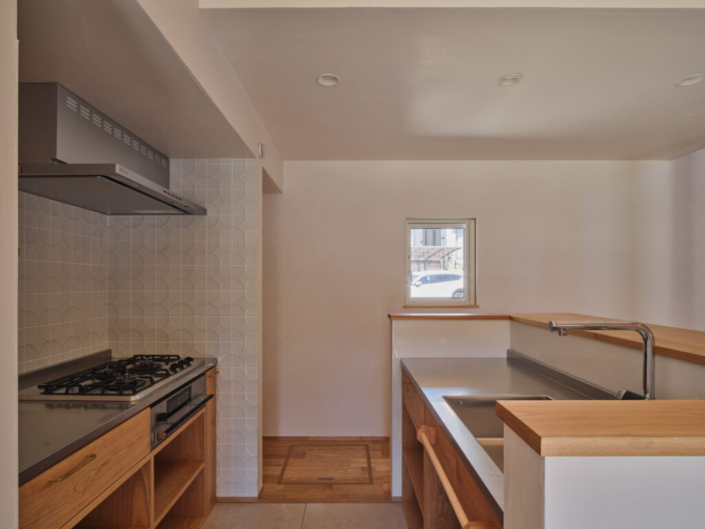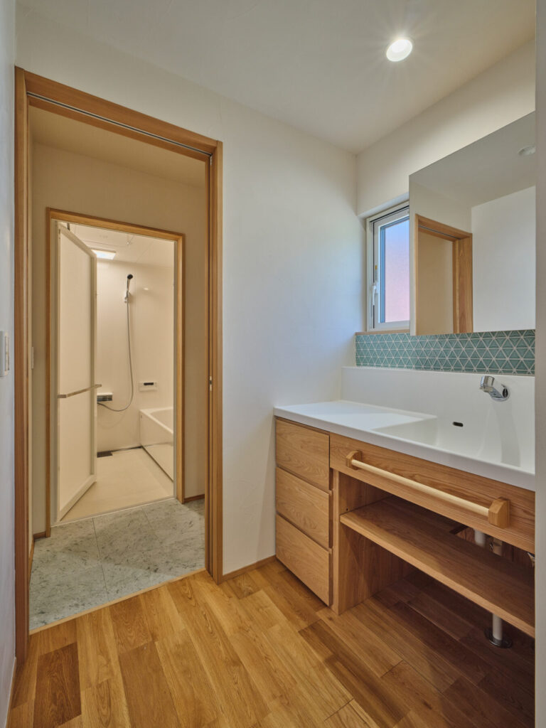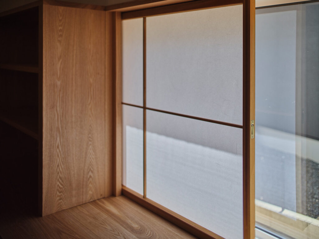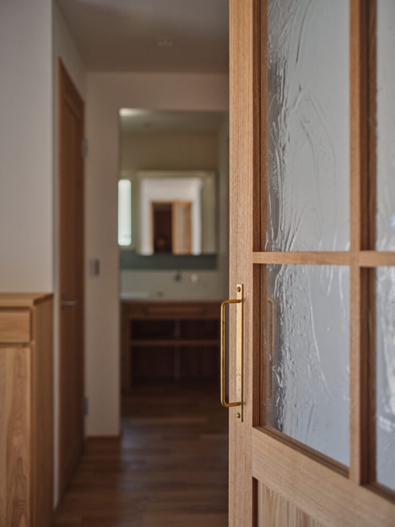 建具やキッチン、洗面台は全てオーダーメードの造り付け。タモやヒノキなど無垢材をふんだんに使い、手触りや質感にも妥協がありません。外壁はEPSボードによる外断熱、内壁は熊本天然漆喰仕上げ。細部まで職人の技が息づき、年月を重ねるごとに味わいが増す住まいとなっています。