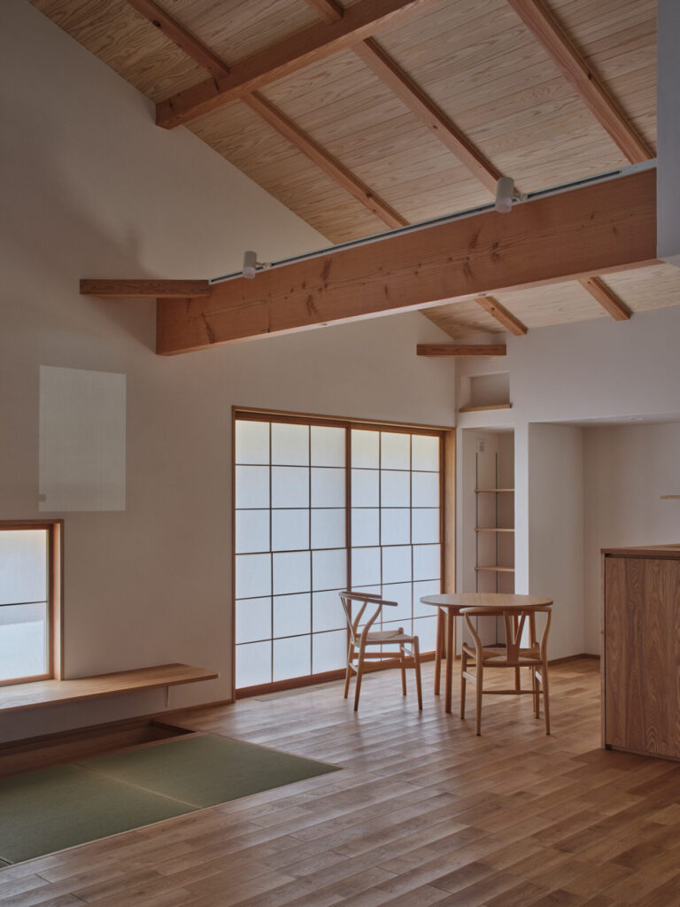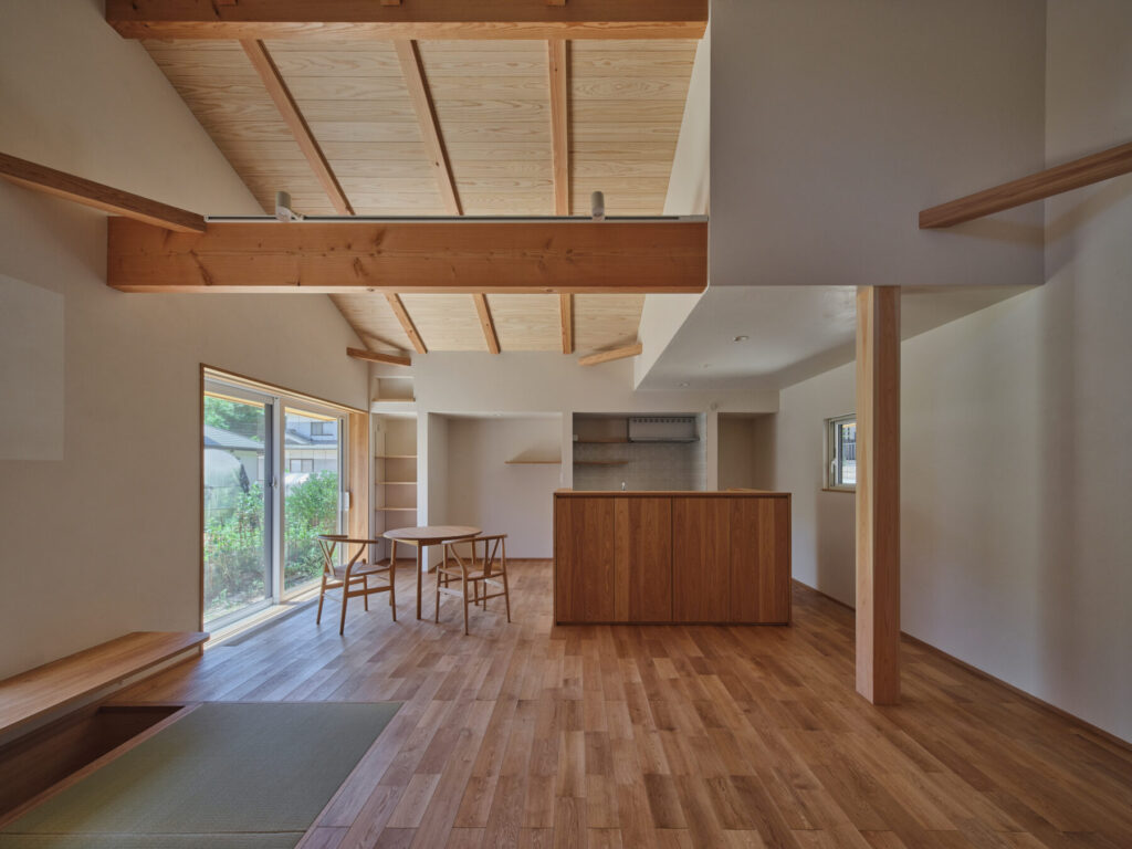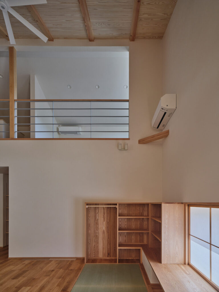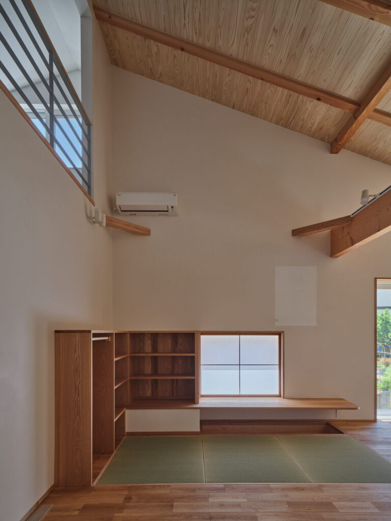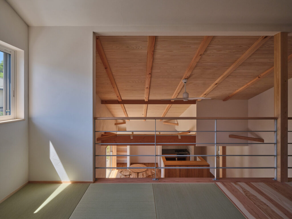 最大の特徴は、ロフト部分を畳敷きに仕上げ、家族全員が布団を並べて眠る設計です。梁の配置等を工夫し、耐震等級3を取得。将来的にはロフトを壁で仕切ったり、1階にも寝室として使えるスペースを確保するなど、家族構成やライフステージの変化にも柔軟に対応できる工夫が随所に盛り込まれています。