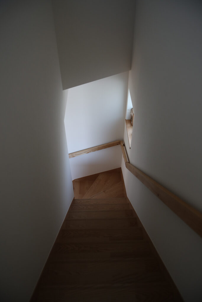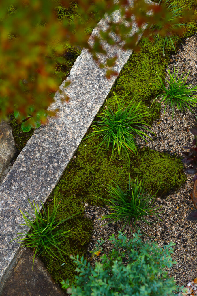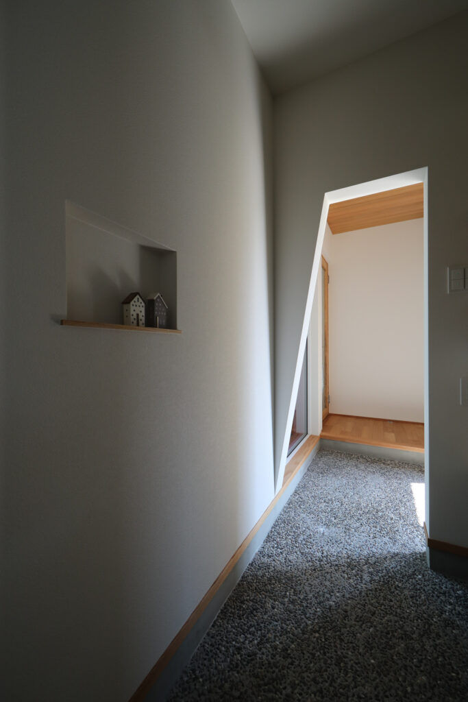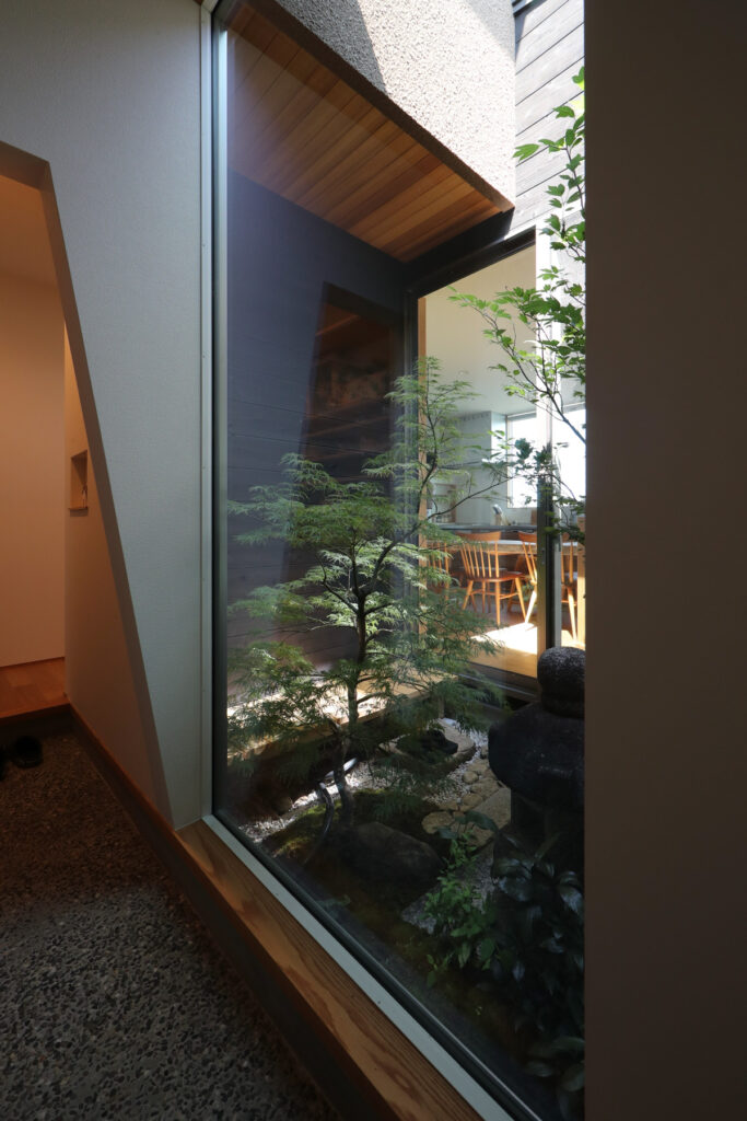 玄関を開けると広がる1坪強の中庭には、灯籠や紅葉、苔、ヒノキの縁側が配され、外からは想像できない静謐な和の世界が広がります。中庭を囲む回遊動線や焼き杉板の壁面が、内側と外部をゆるやかにつなげています。ご主人の造園センスと設計者の工夫が融合し、日々の暮らしに四季の移ろいと安らぎをもたらします。実際の生活が始まってからも、家族や来客が心から安らげる場所として親しまれています。計画から完成までの長い道のりも、楽しみながら理想を形にした住まいです。