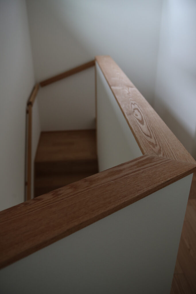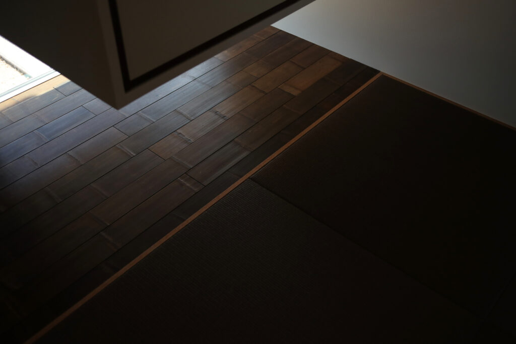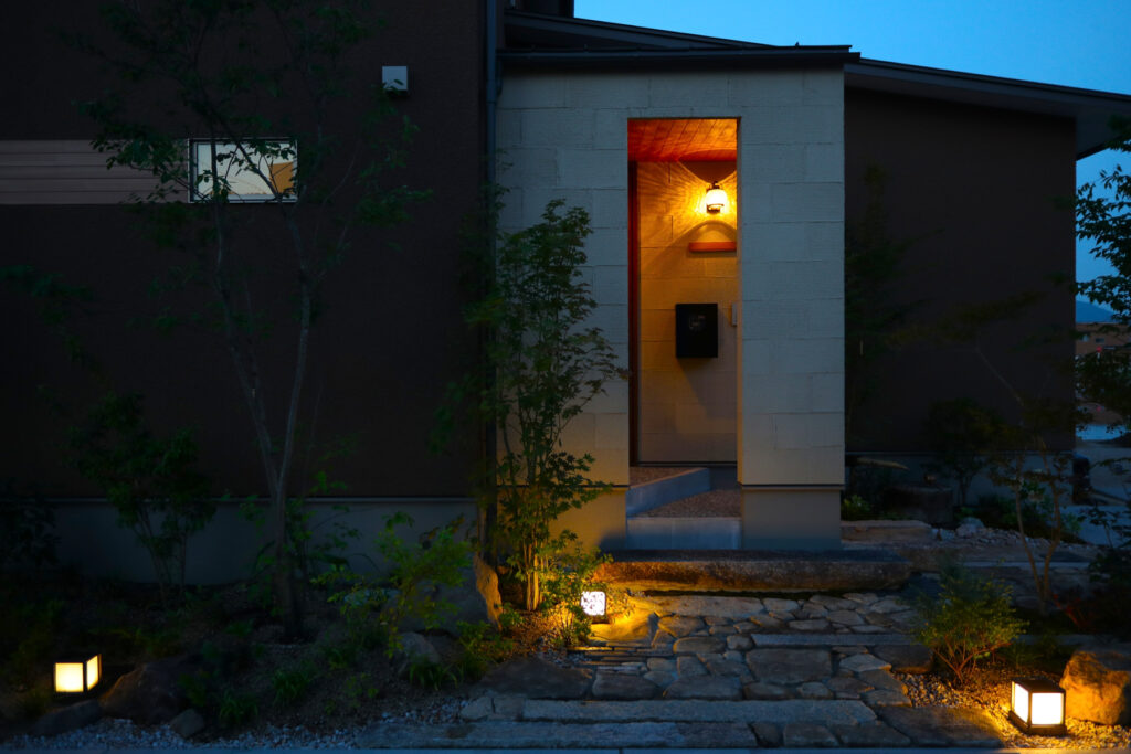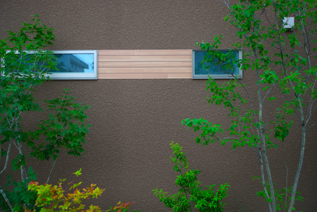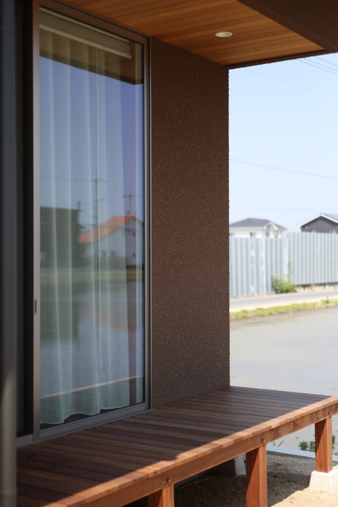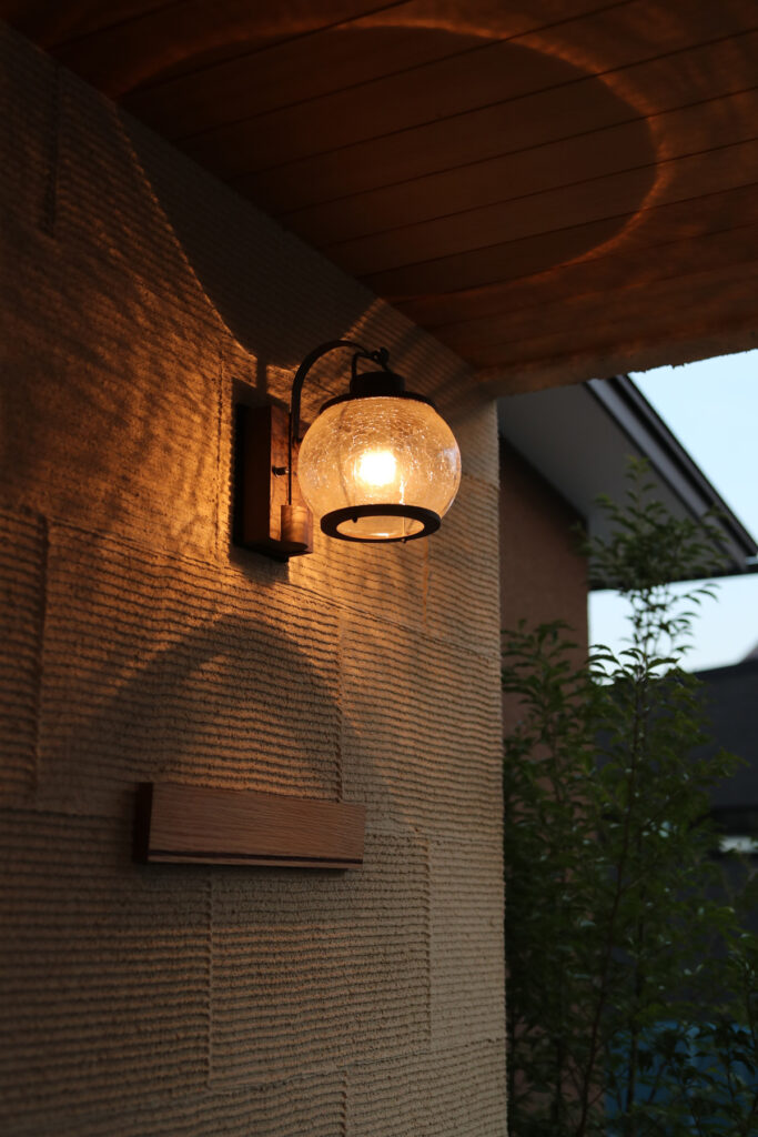 玄関周りはベージュ系ベルアートの櫛引仕上げで、夜間のライトアップ時に浮かび上がる横ラインが印象的です。ウッドデッキにはセランガンバツを用い、杉板の軒天や縁側風の設えが和洋折衷の趣を添えます。雨樋やサイディングの納まりにも配慮し、厚みやラインの美しさを追求。畳コーナーには栗やくるみ、竹など多彩な素材を採用し、踏み心地や色合いにもこだわっています。職人との綿密な打ち合わせを重ね、細部まで美しく仕上げました。