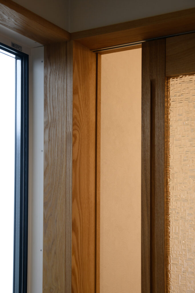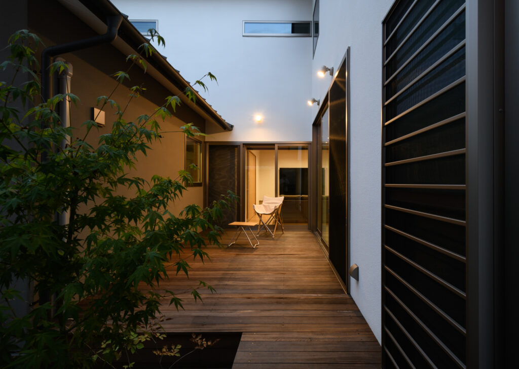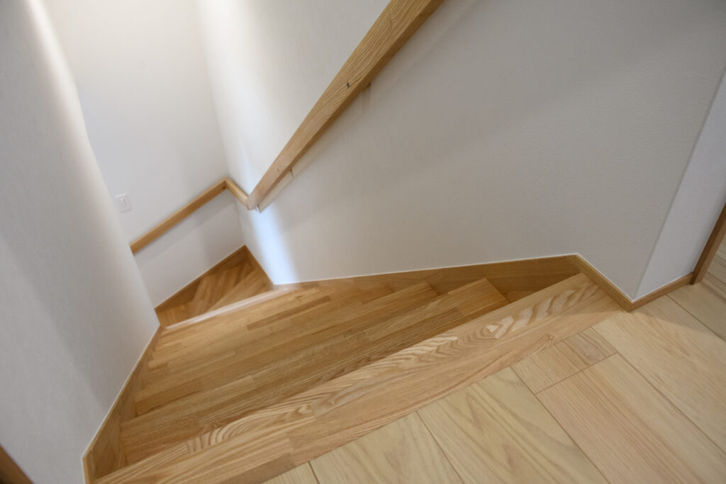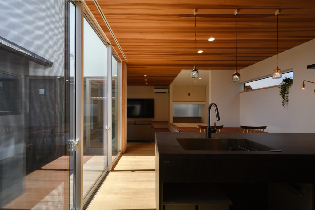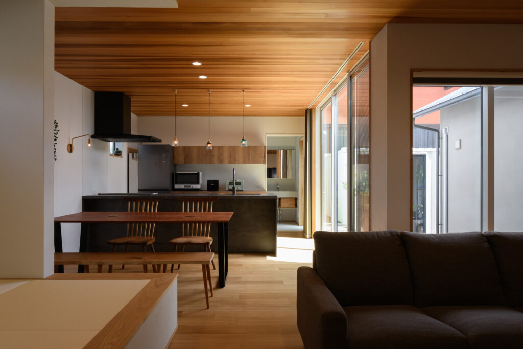 天井から壁へと連なる無垢材の表情が、住まい全体に柔らかな陰影をもたらします。大開口の窓からは中庭の緑と自然光が注ぎ込み、朝の目覚めを心地よく演出。畳コーナーや造作扉、職人技が光る手すりなど、細部にまでこだわった設えが、家族の時間を豊かに彩ります。素材のぬくもりと光の移ろいが、日々の暮らしに静かな高揚感をもたらします。