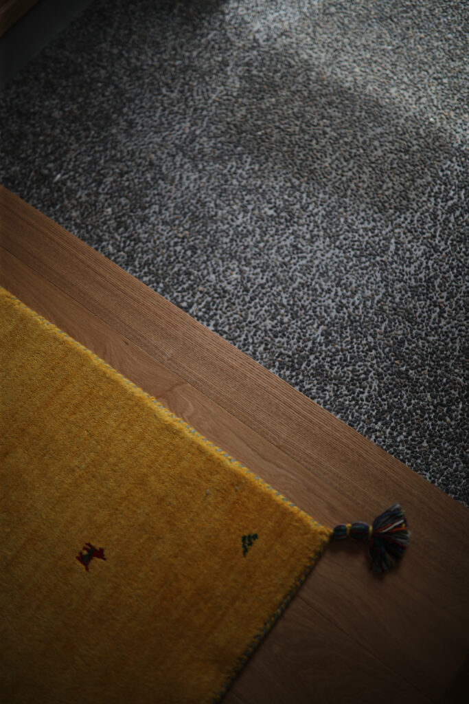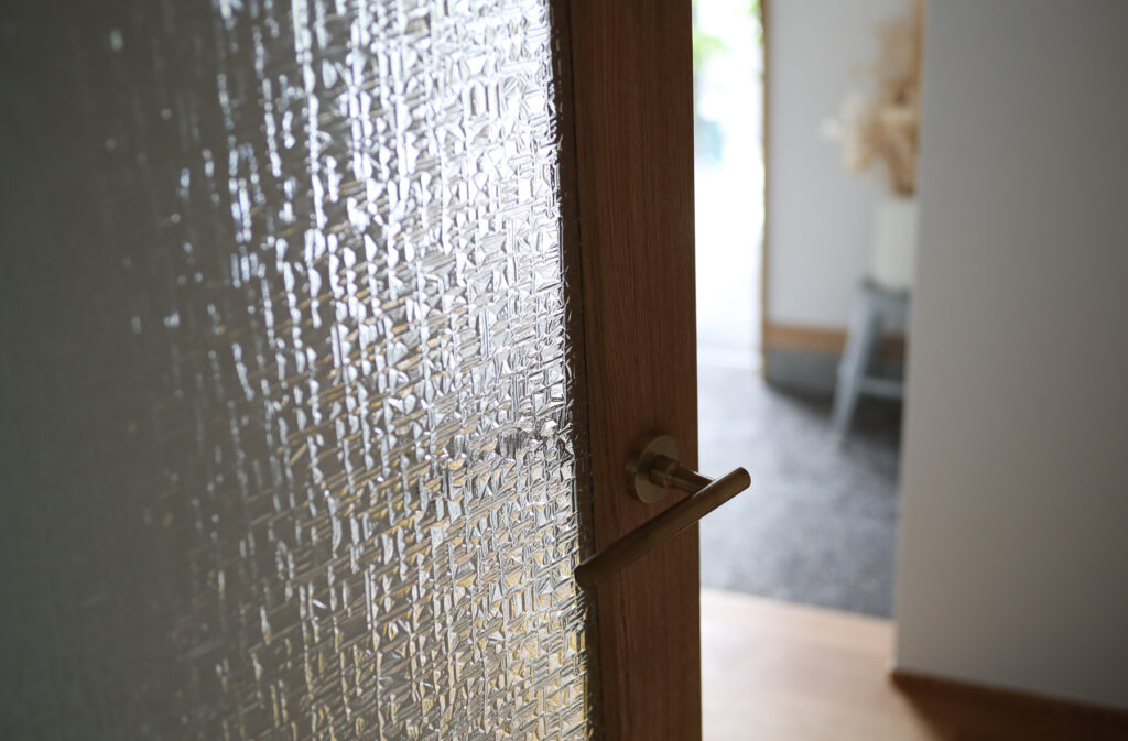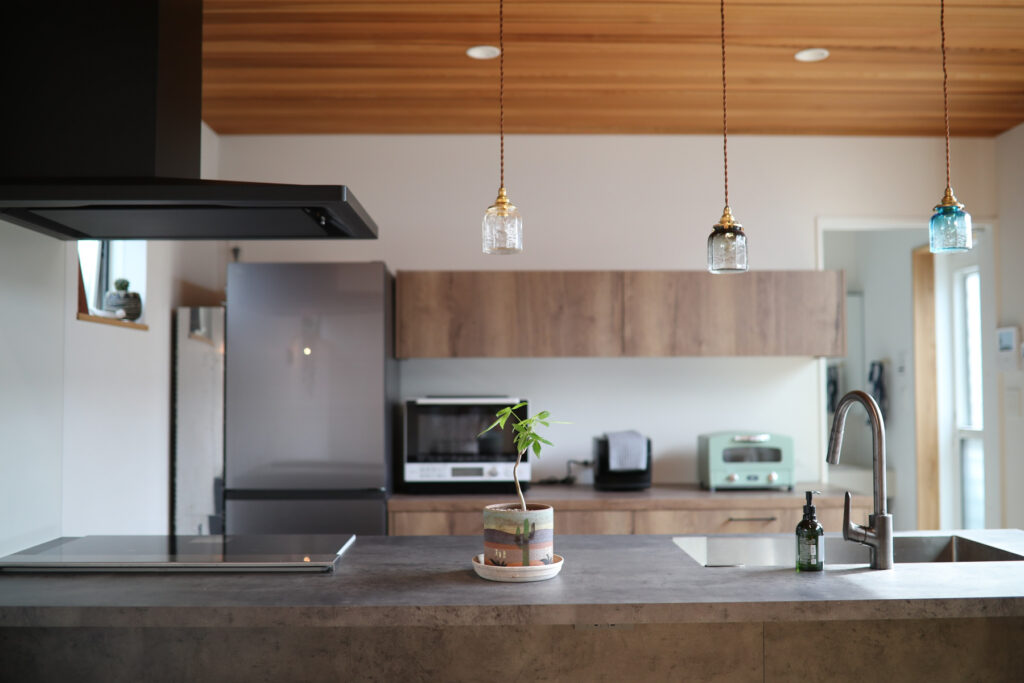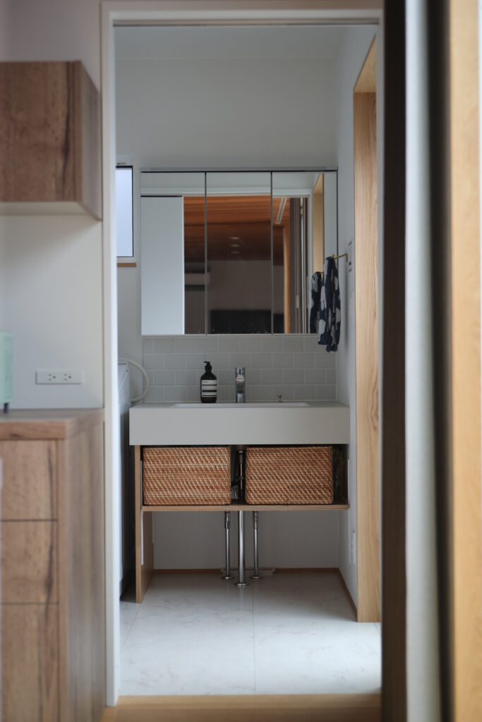 キッチンは「グラフテクト」のスタイリッシュな仕様で、広々とした作業スペースと回遊動線を確保。洗面台やトイレにはマットグレーや無垢材を用い、清潔感とあたたかみを両立。収納籠やオープンスペースなど、日常の使い勝手を高める工夫が随所に施されています。ガラス作家の照明や真ちゅうのパーツが、空間にさりげない個性を添えています。