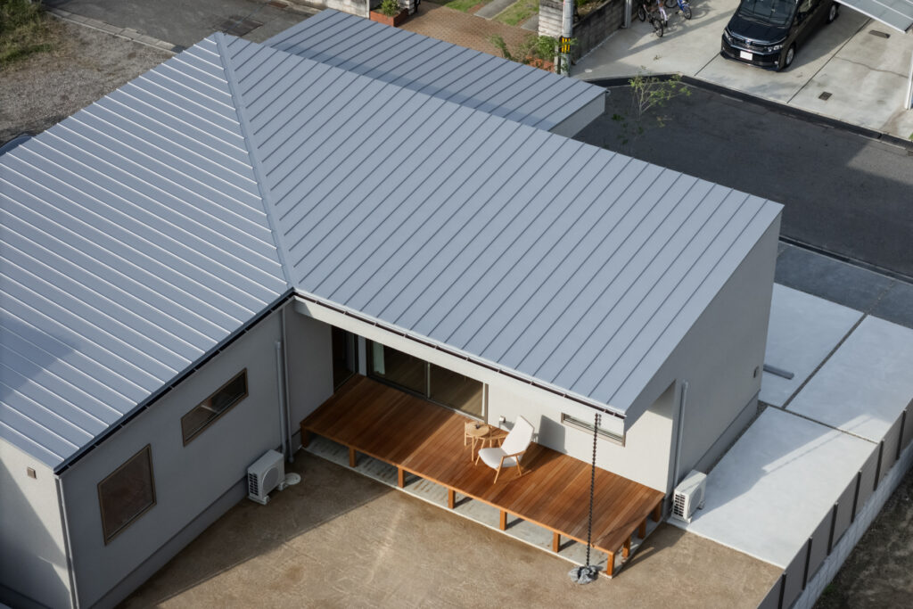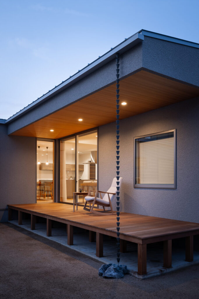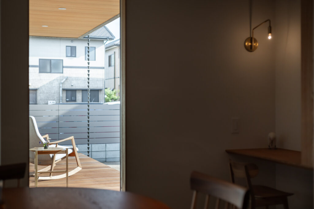 深い軒の下に広がるウッドデッキは、柱を設けず長スパンを実現。内外の境界を曖昧にし、視界が伸びやかに広がります。ダイニングや書斎など、心安らぐ居場所も点在。将来にわたり、日々の営みを豊かに彩る設計です。