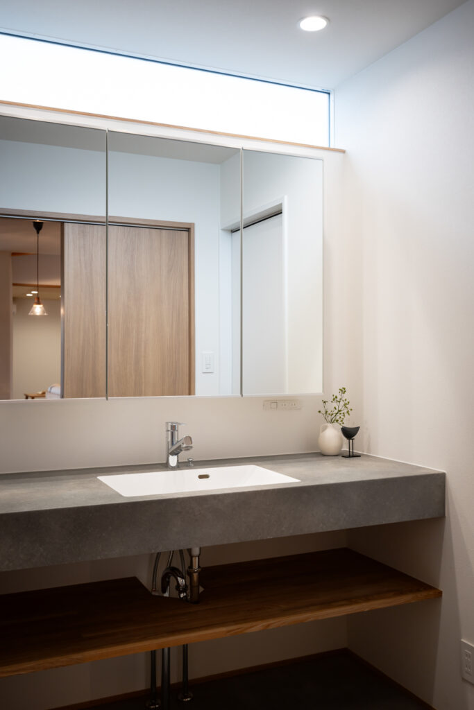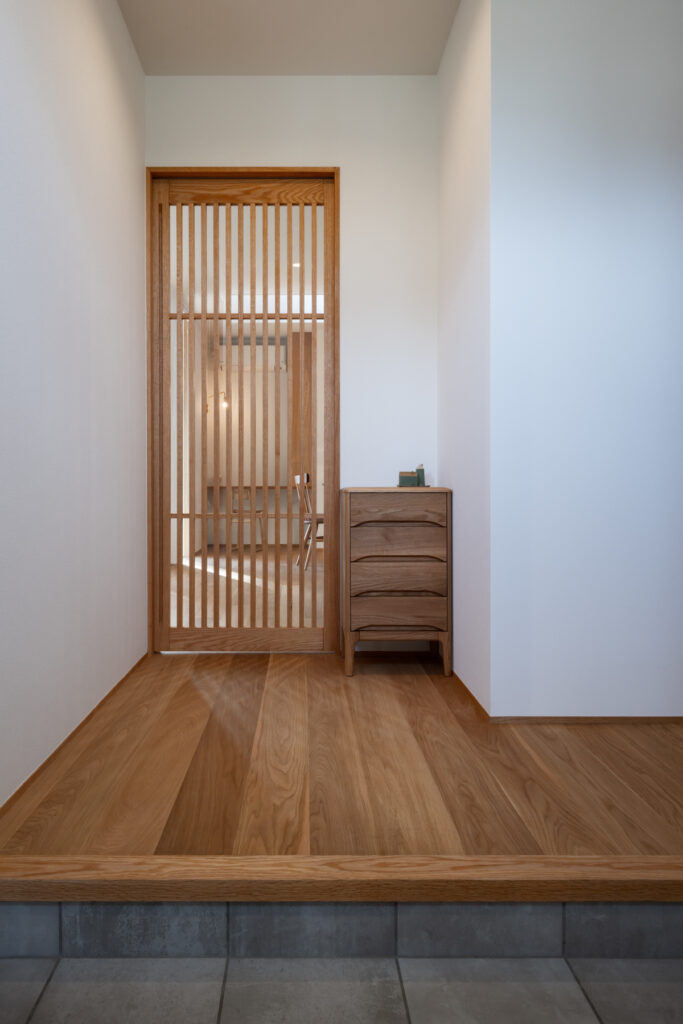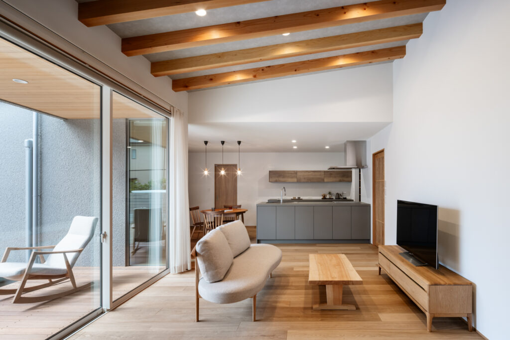 北と西の2面で庭を包み込むように配したL字型の構成が特徴です。 勾配天井のリビングと小上がり和室が連なり、 明るさと奥行きを両立。建具や窓枠の納まりまで徹底的に吟味し、 設計士と棟梁が細部にまで手間を惜しまず仕上げています。 住み手とつくり手、 双方の想いが随所に刻まれた住まいです。