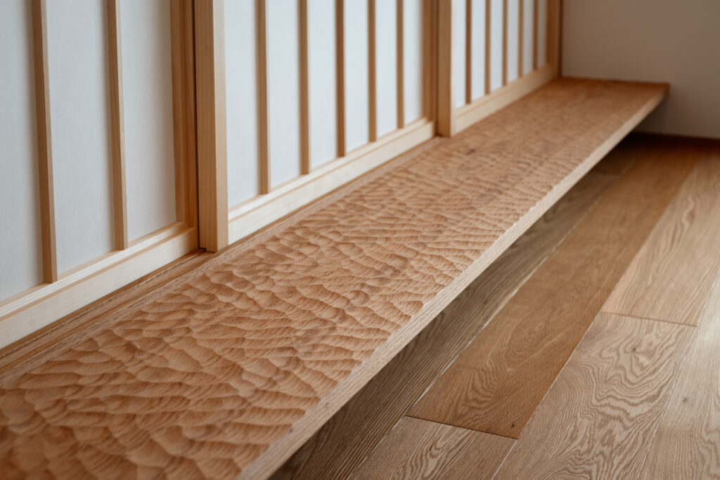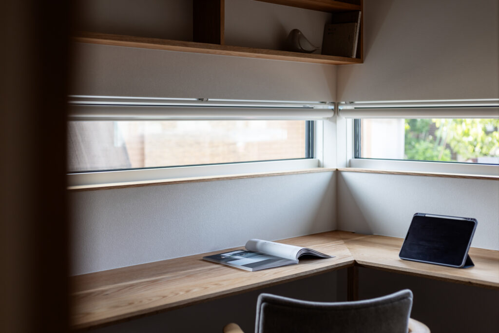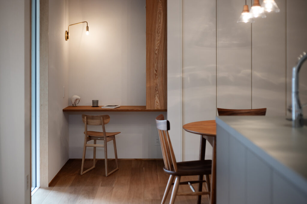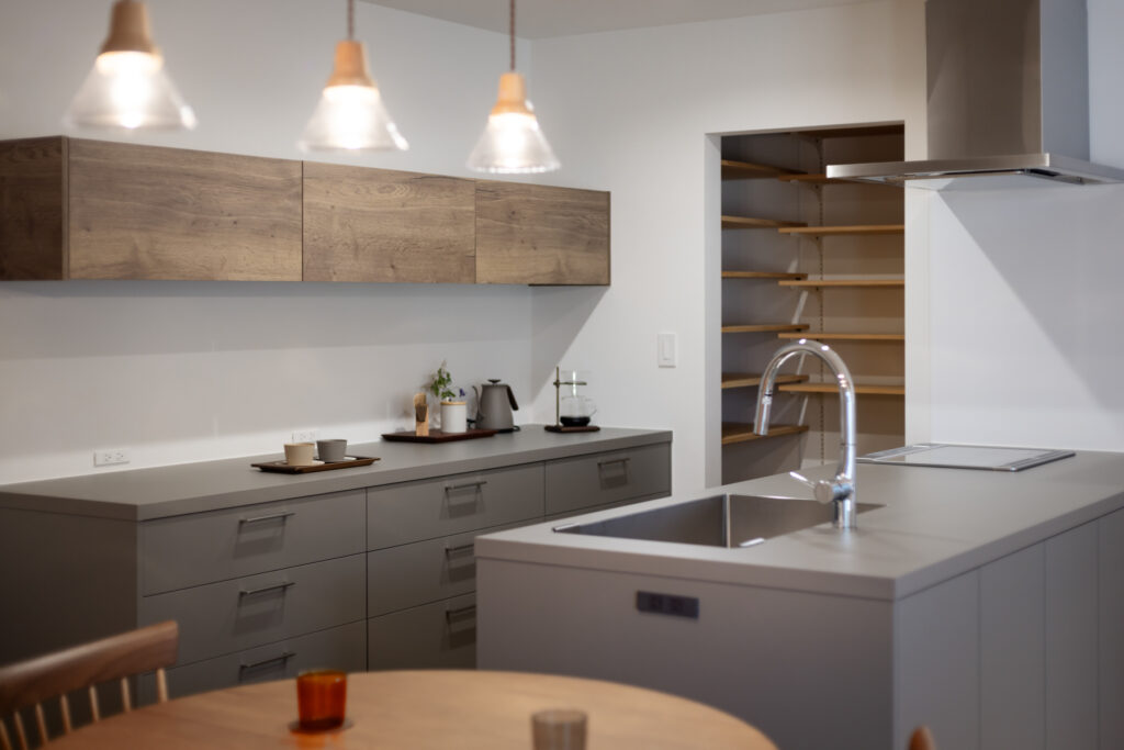 自社保有の無垢材を適材適所に用いて、和室の上り口にはなぐり加工の一枚板を採用。掘りごたつやデスクコーナーも棟梁の手造りです。グレージュのキッチンや真ちゅうの照明など、素材の選定と組み合わせにも独自性が光ります。パントリーから裏動線まで、家事効率も追求されています。