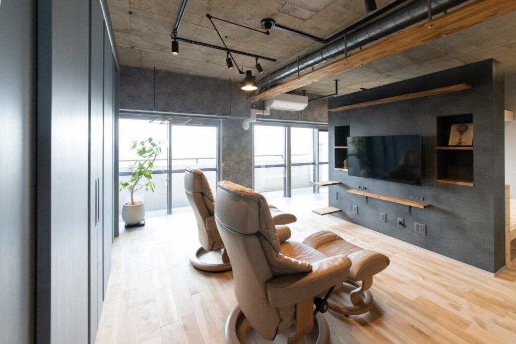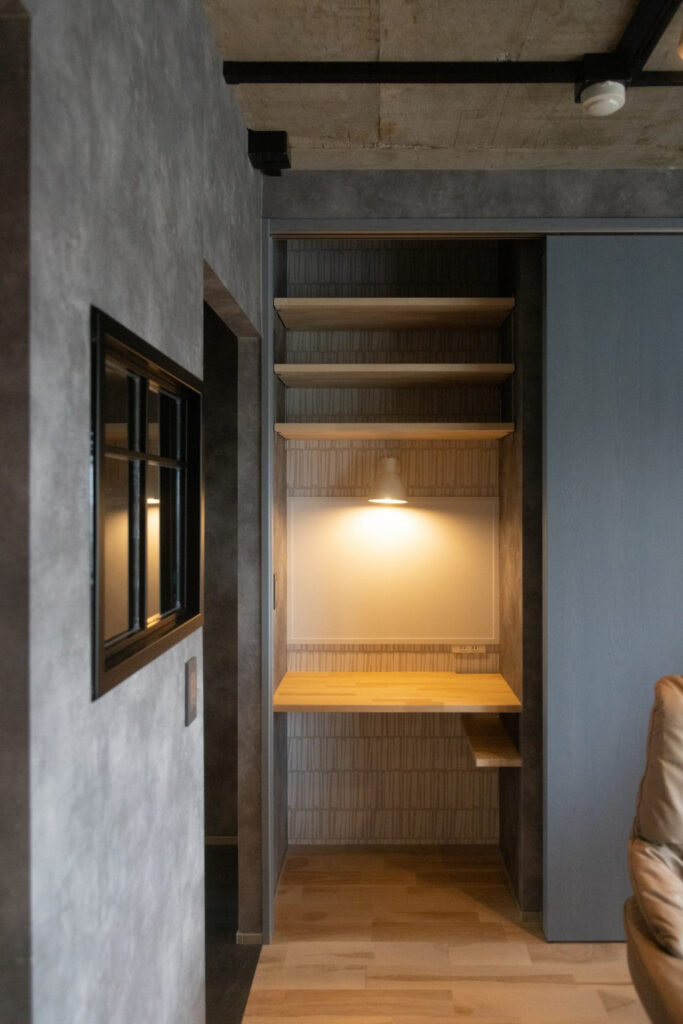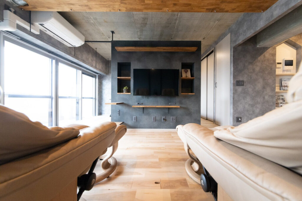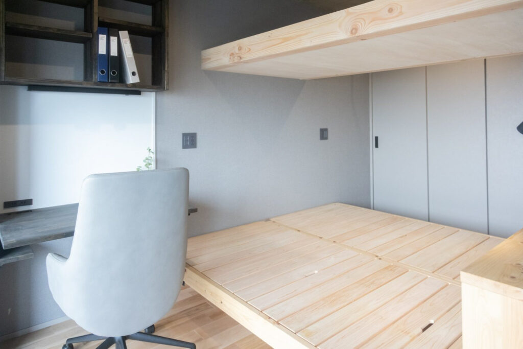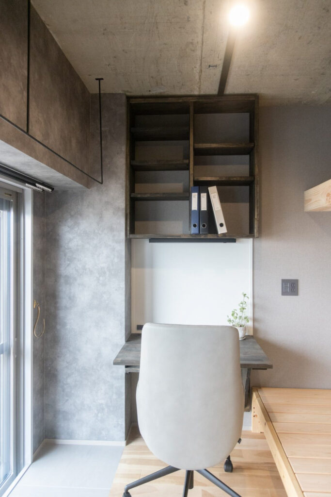 テレビ背面にはロフト付き寝室を配置し、縦方向の容積を最大限に活用しました。ロフトが収納力を補い、床面積を圧迫せずに物の居場所を確保します。ご夫婦それぞれのワークスペースには、タップコンセント用の固定棚を下部に設置。カウンターにはお好みの色でオイル塗装を施し、機能と美観を両立させた専用デスクが完成しました。