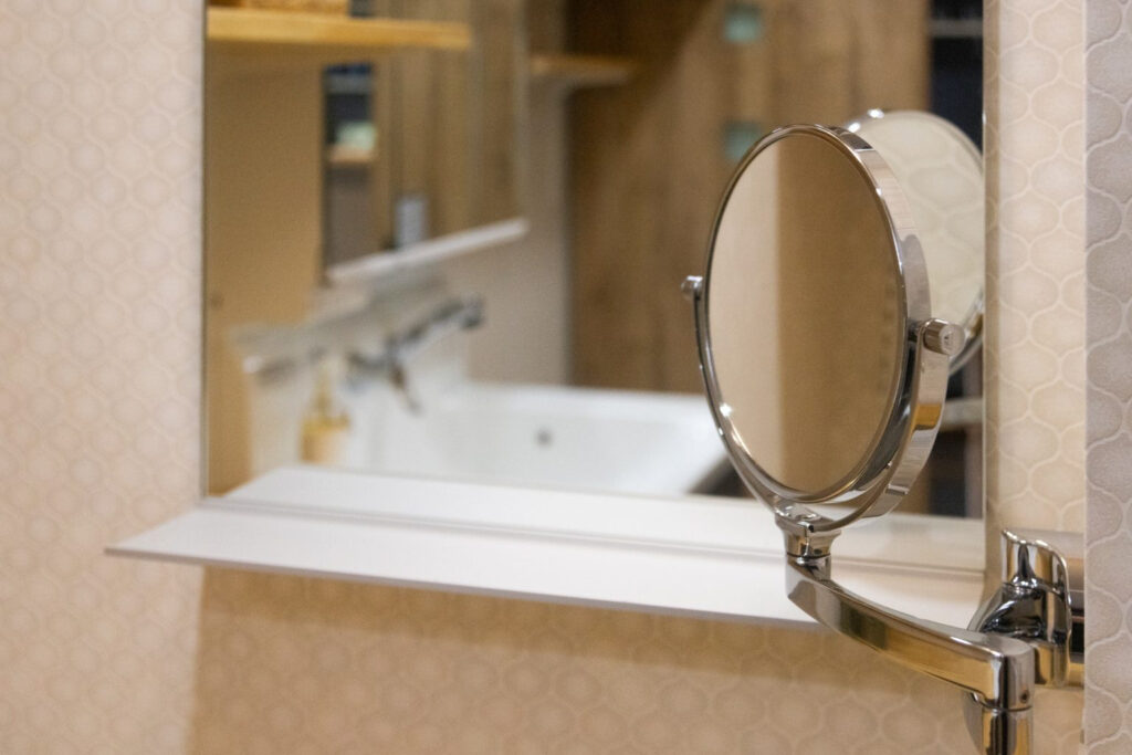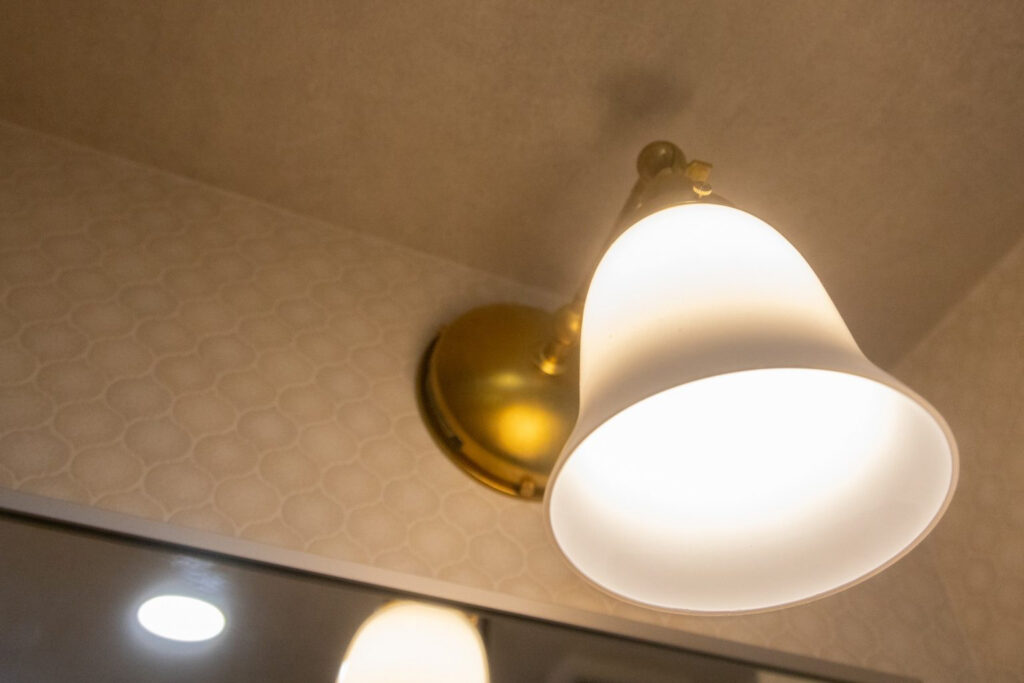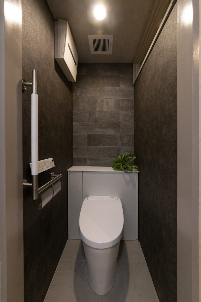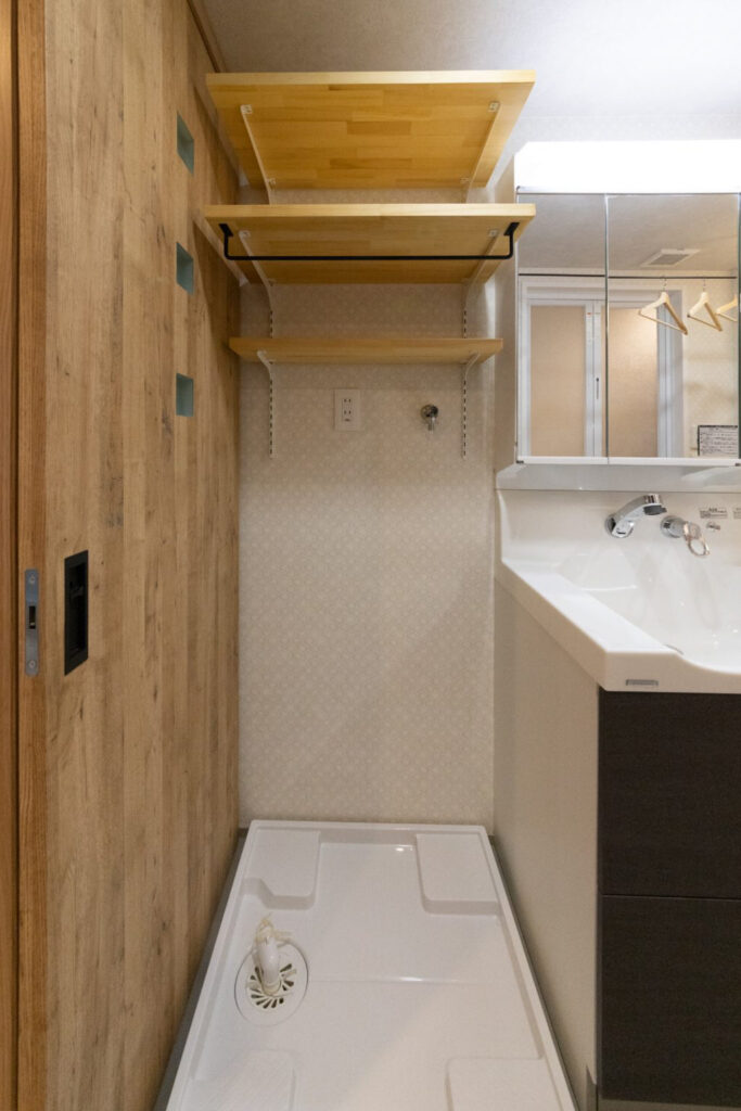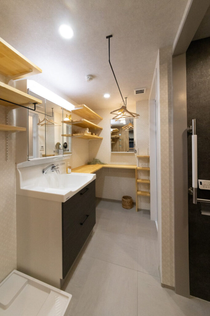 トイレはオープンな構成で空間の連続性を保ちます。洗面脱衣室にはパウダースペースを独立して設け、身支度の動線を整理。細部まで素材選びにこだわり、無垢材・漆喰・タイルといった自然素材が呼応し合う構成です。DIYで手を加えた箇所が愛着を深め、住まい手の個性が隅々まで息づく仕上がりとなっています。