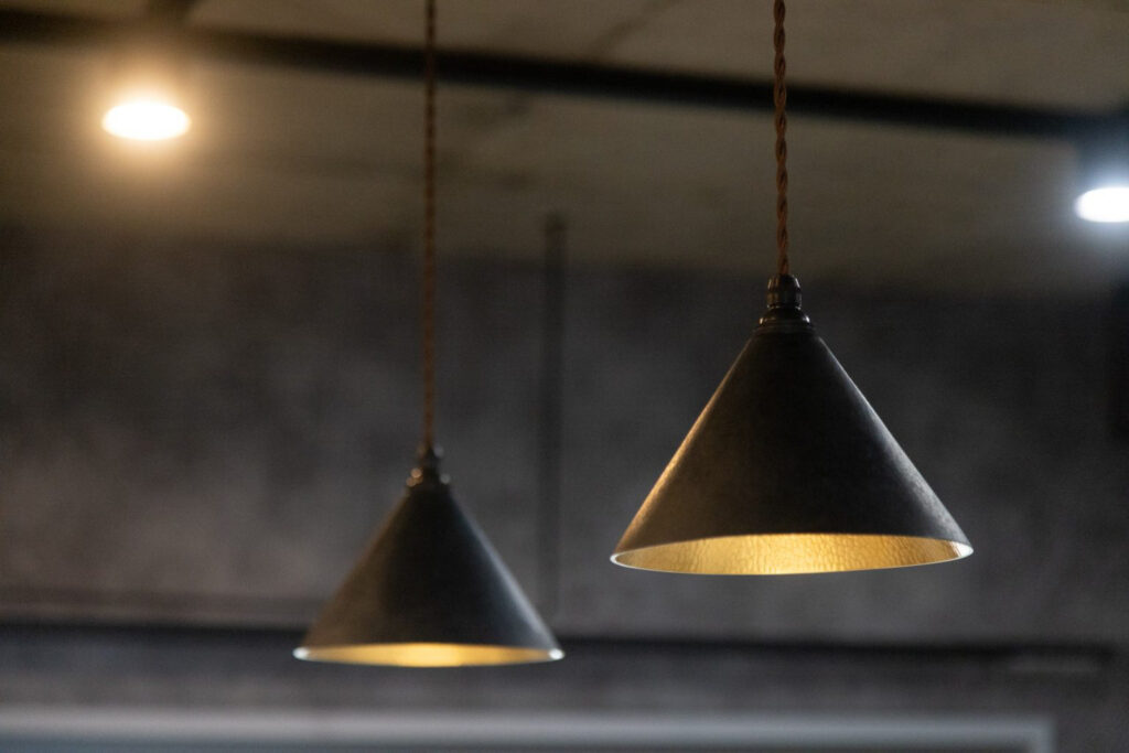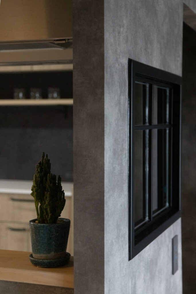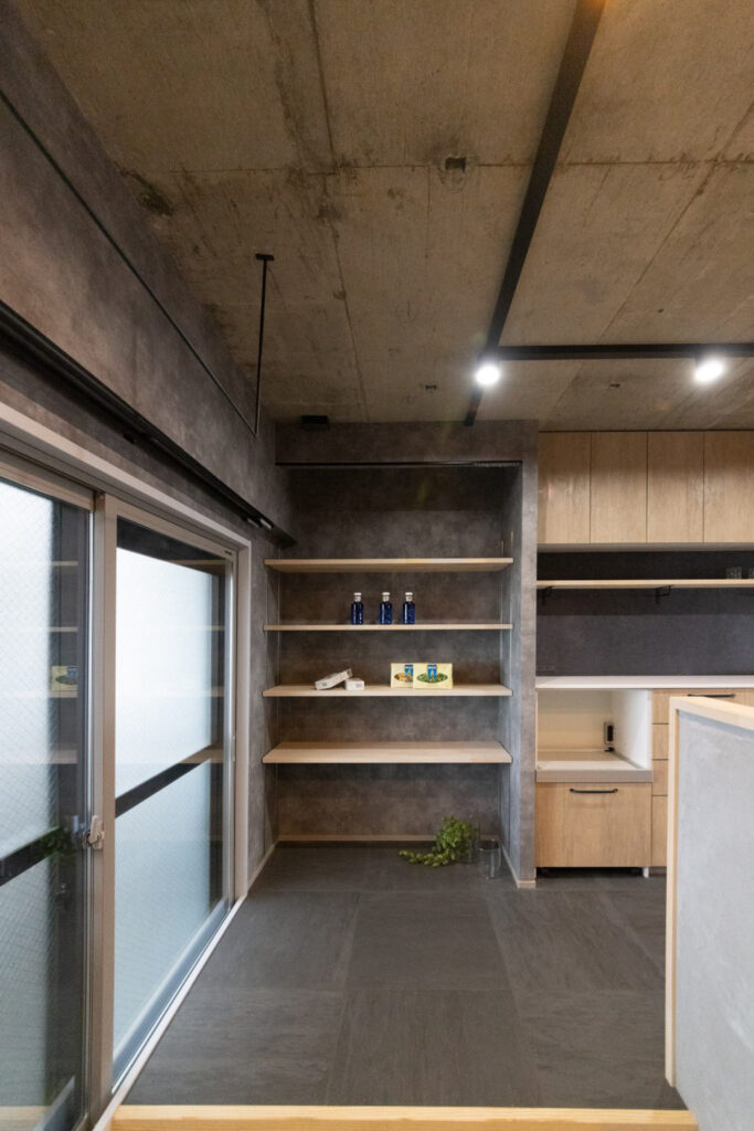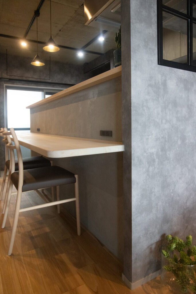 極力仕切りを排した間取りが、視線の抜けと奥行きを生み出しています。天井は躯体を現し、構造美と高さを同時に獲得。無垢フローリングが足元かぬくもりを伝え、漆喰をDIYで仕上げたキッチン腰壁が手仕事の味わいを添えます。「FUTAGAMI」のペンダントライトがダイニングカウンターを柔らかく照らし、日常に上質なリズムをもたらす設計です。