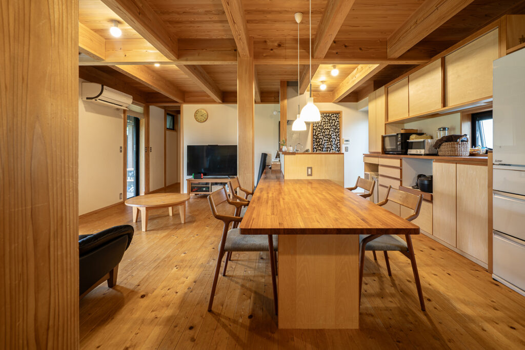 大テーブルを中心に据えて、家族全員がゆったり過ごせるリビング