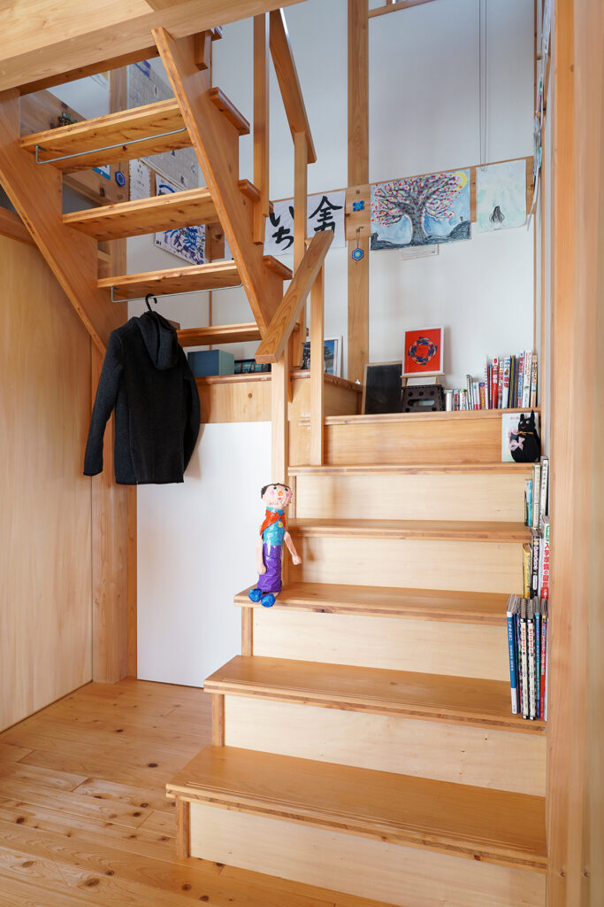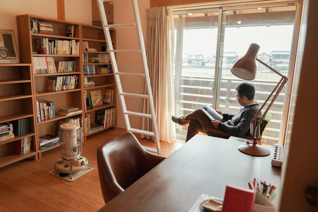 Sさんの家で目をひくのはたくさんの本や絵本。ゆとりのある階段はギャラリーとして活用され、「今日のオススメの本」や、子どもたちの個性豊かな絵などが飾られています。2階の「読書スペース」にはご夫妻の雑誌や本、小説が並び、ご主人がいつも座っているという一人掛けの椅子からは、のどかな景色が広がっています。