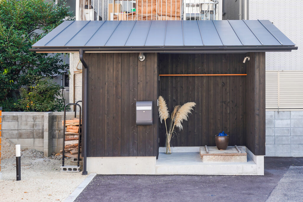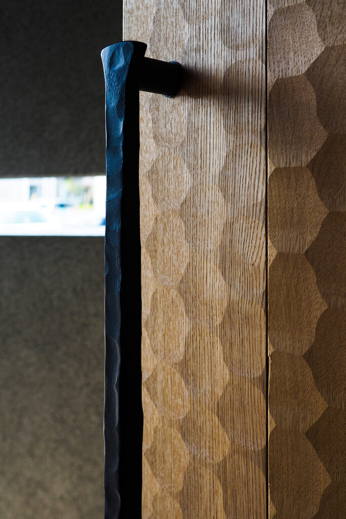 木製の玄関ドアの表面は「ちょうながけ」仕上げです。手彫りならではのランダムな削り跡は、穏やかに波打つ瀬戸内海のよう。やわらかい木の風合いのなか、黒い鉄製の取っ手がアクセントになっています。