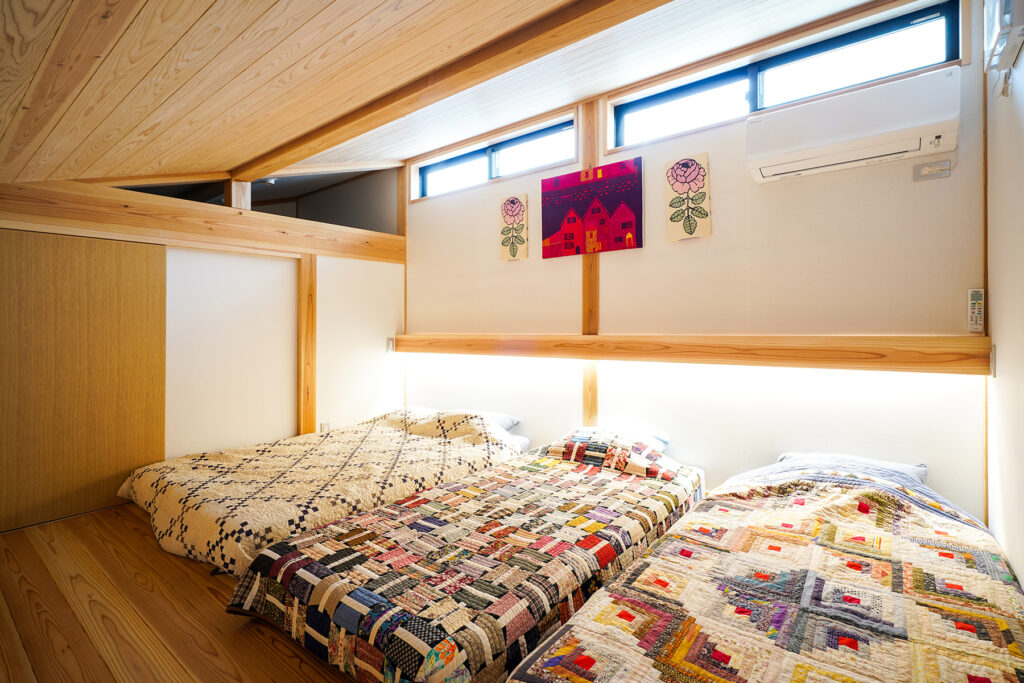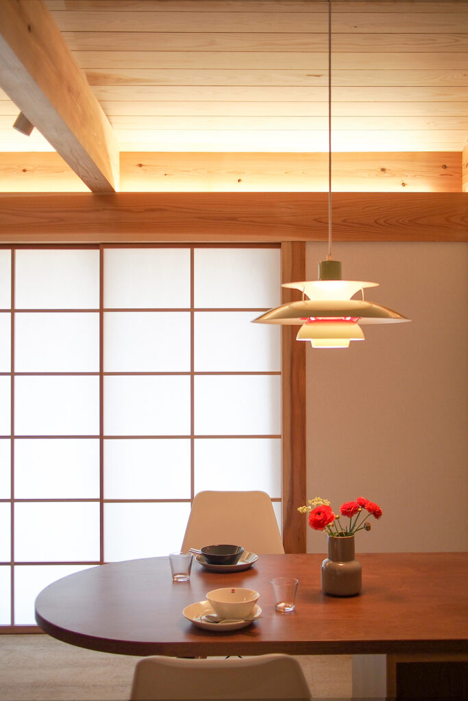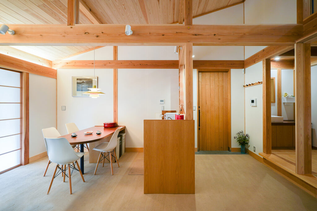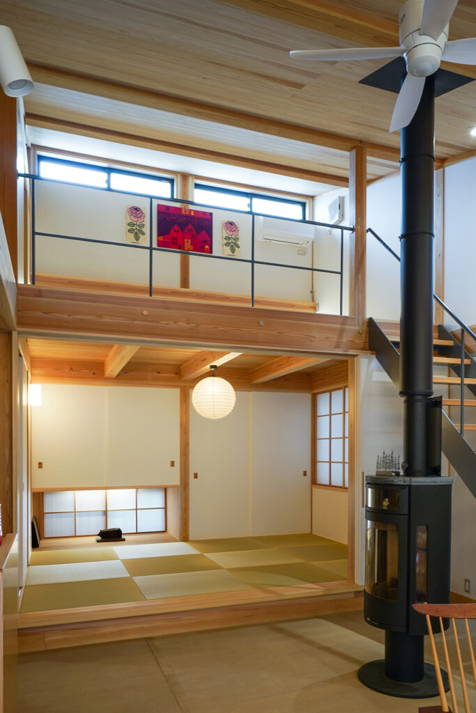 薪ストーブのある吹き抜けのリビング、スケルトン階段と落ち着いたグレーの手すりなど、15年間住み慣れた母屋の造りを取り入れた間取りです。住まいの中心に薪ストーブを据えて、ほぼすべての生活動線を1階にまとめています。どの空間にいても薪ストーブを中心にしたワンフロアでつながり、仲の良いご夫婦の会話も絶えません。