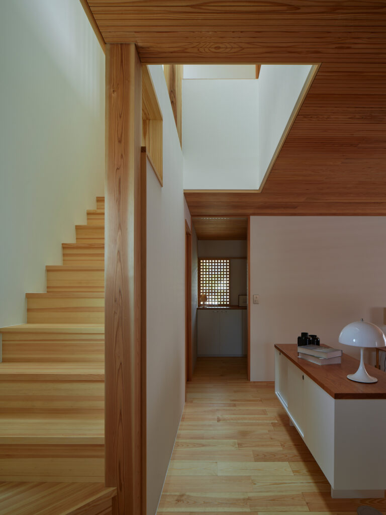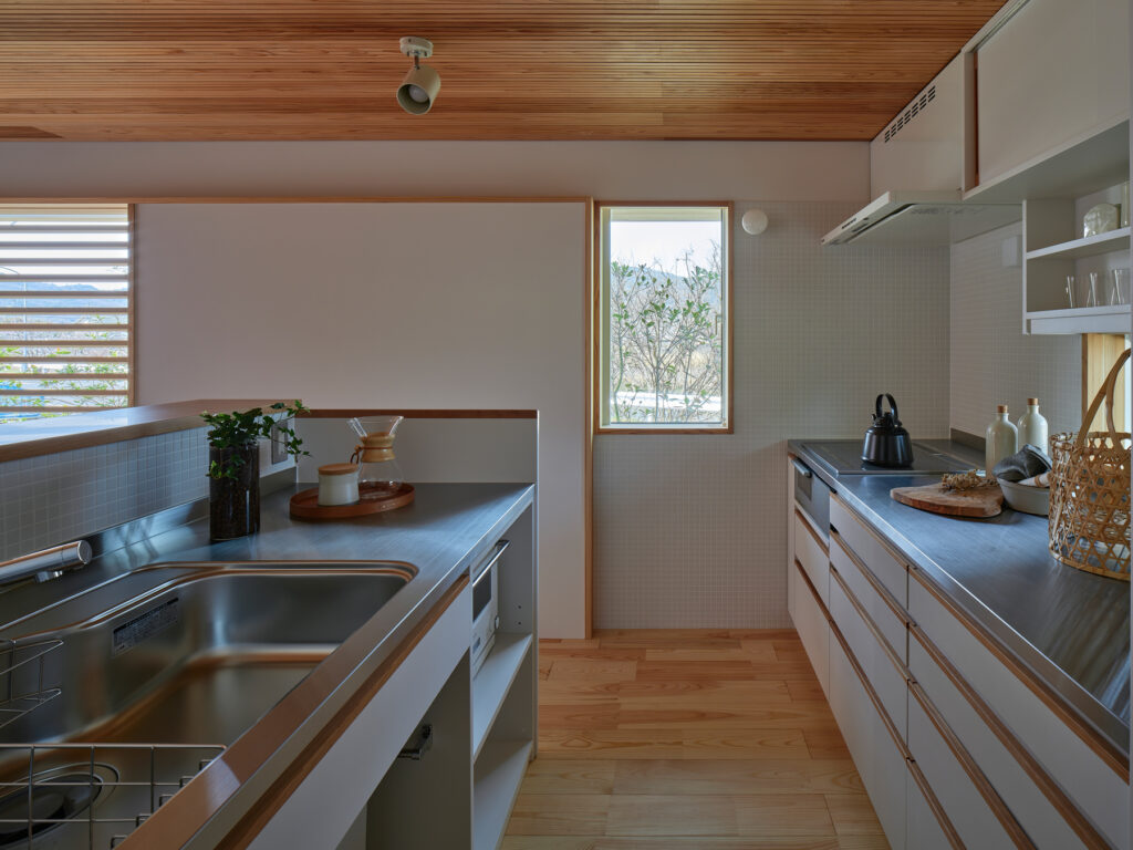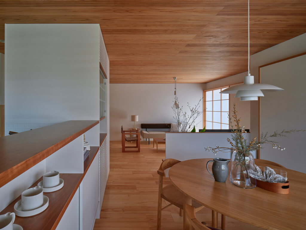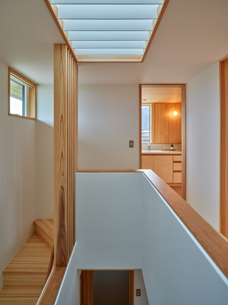 住まいの南は全面窓ではなく、あえて閉じた「たまり」の部分を設けて、上質な落ち着きをもたらしています。キッチンでは、視線の先々に外を眺められる居心地の良さがあり、山の風景に四季を感じられます。周囲をぐるりと回避できるため、家事動線もスムーズです。吹き抜けを通じて、自然光が階下に届き、冷暖房は全館に循環します。